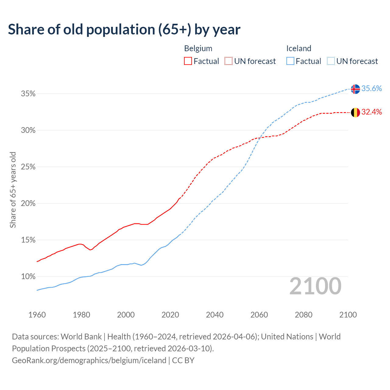 - The share of old-age demographic (65+) in Belgium is 20.6% vs 15.6% in Iceland.