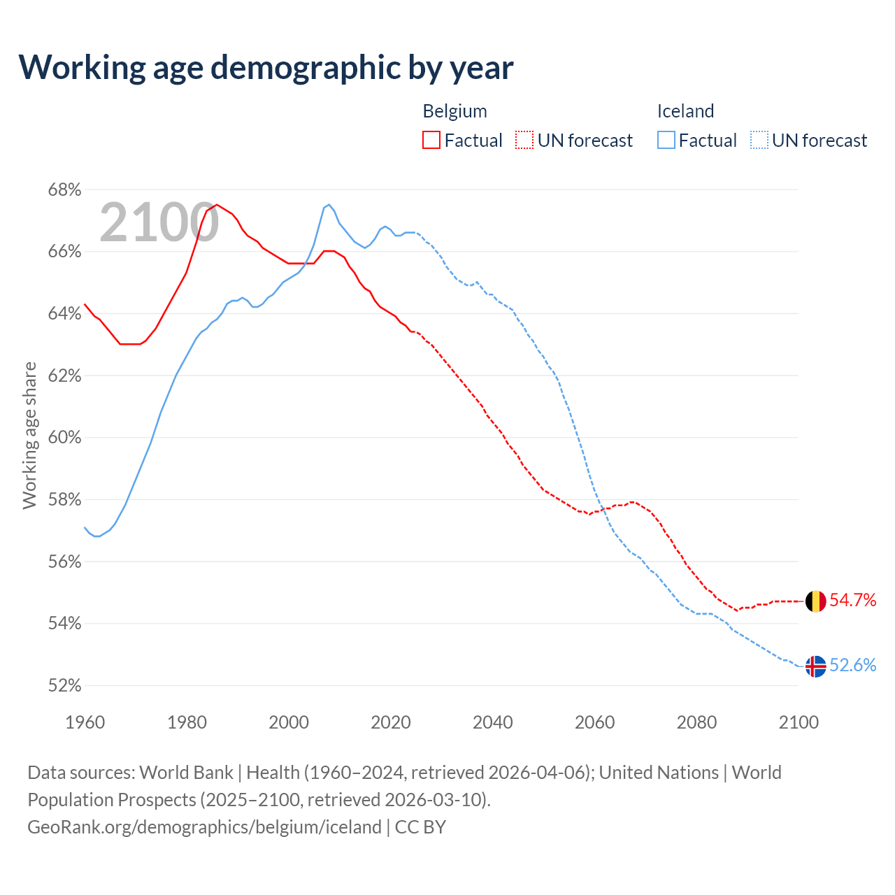 Median age Belgium vs Iceland, 1960-2100