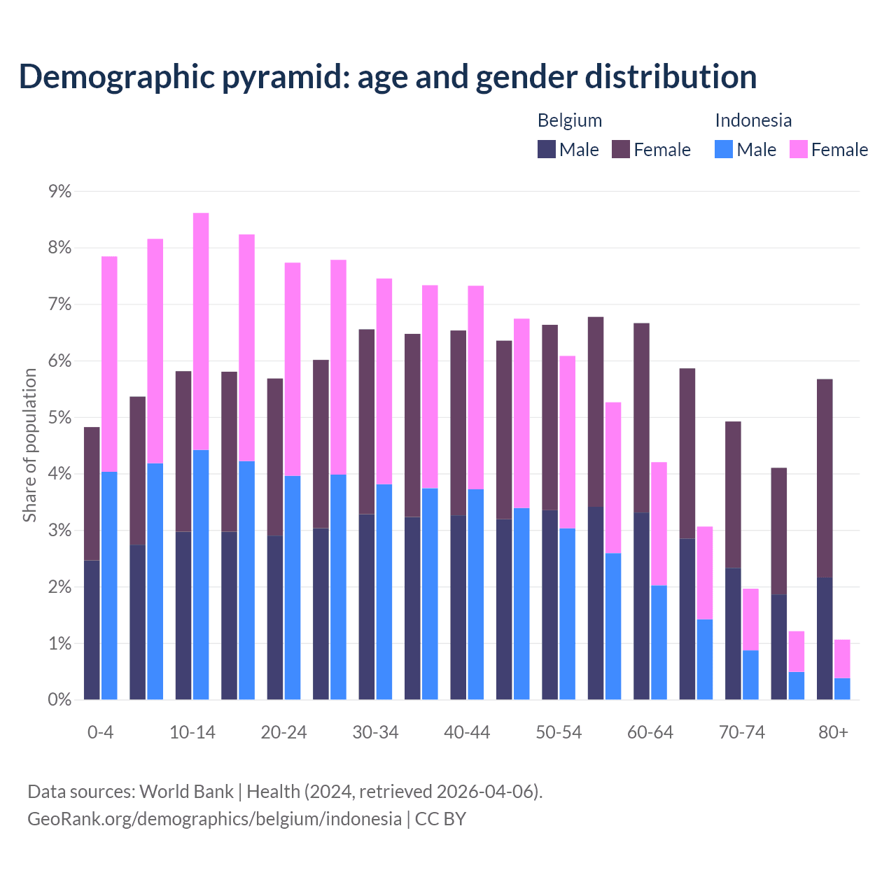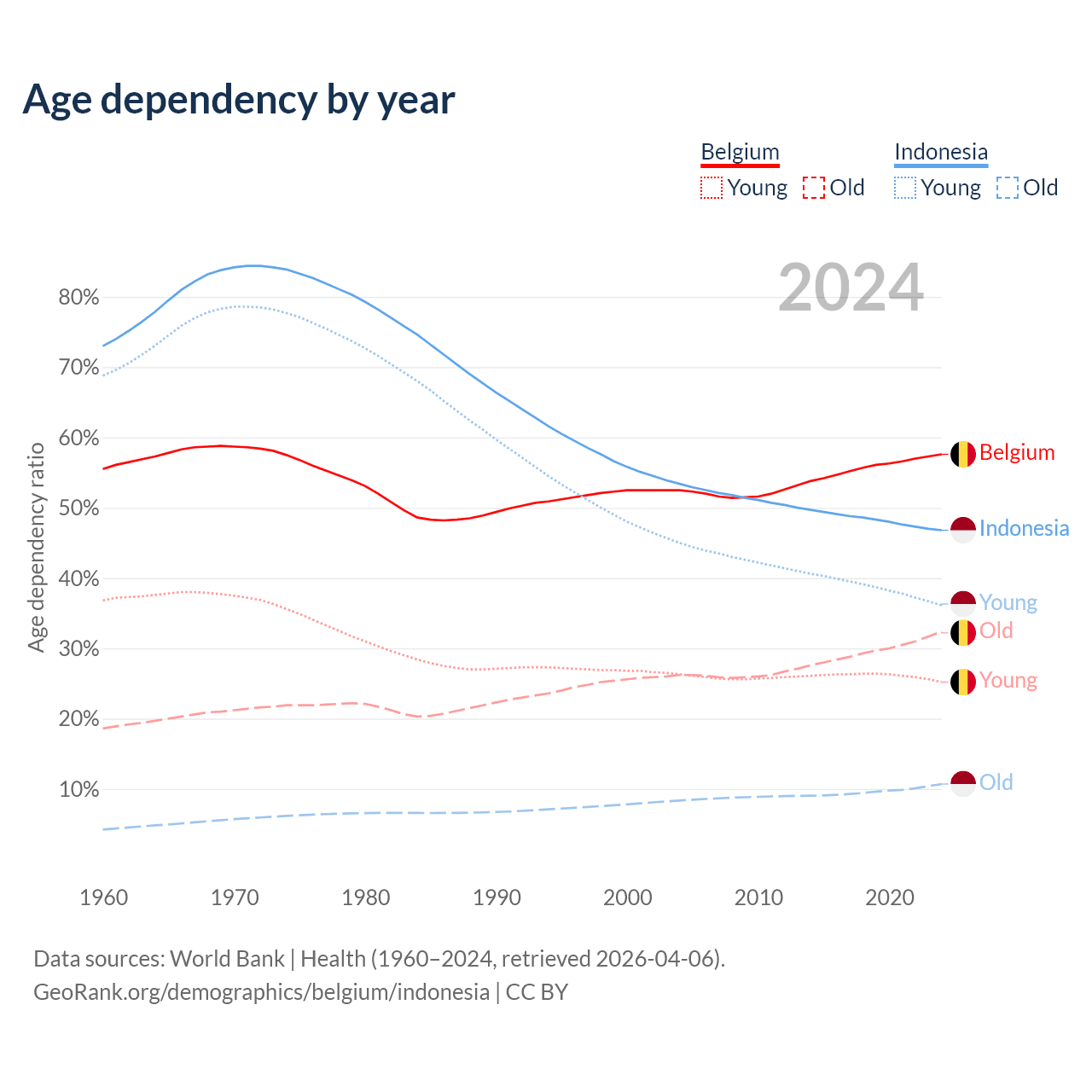 - Belgium is ranked 32/196 by median age (oldest to youngest) vs 93/196 for Indonesia.