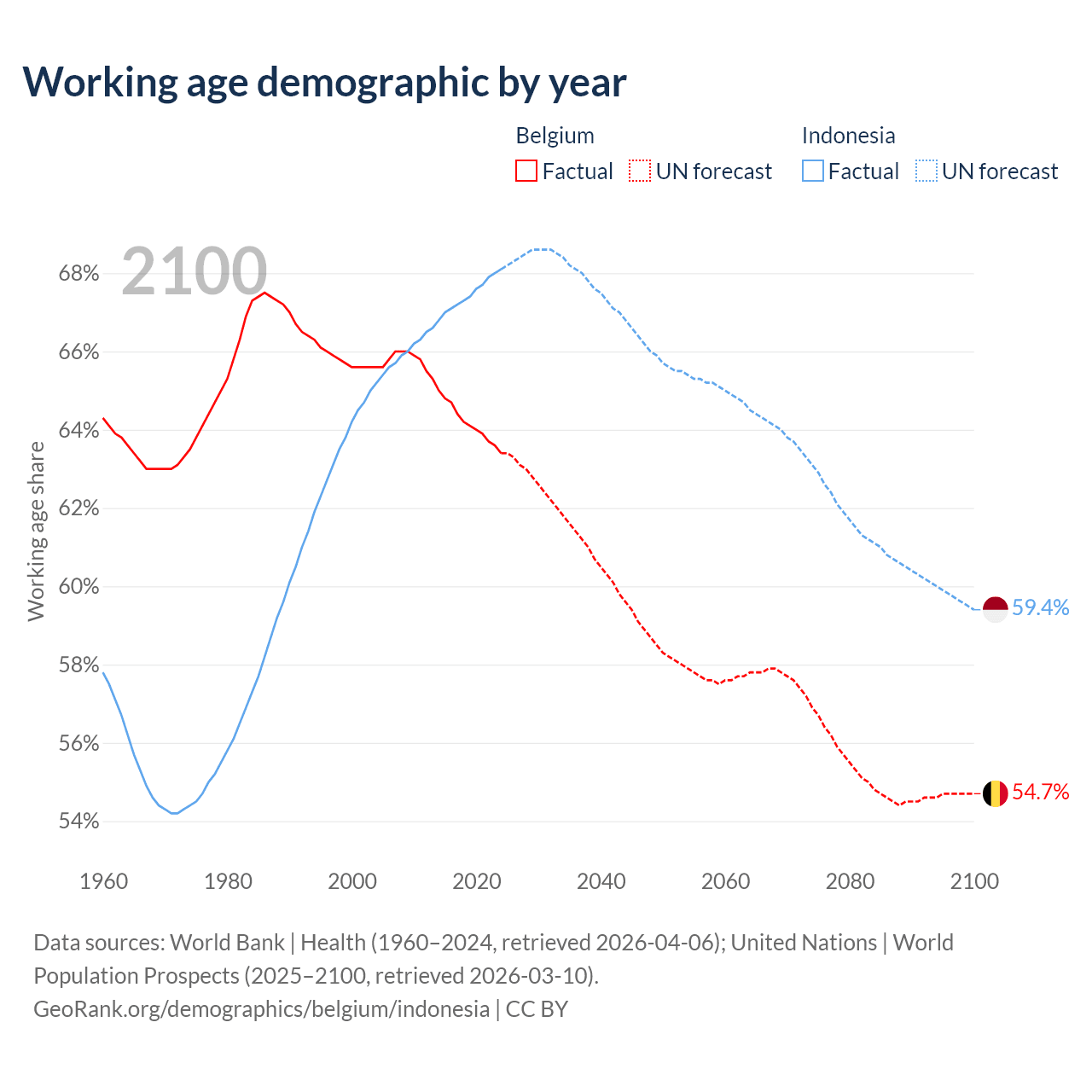 Median age Belgium vs Indonesia, 1960-2100
