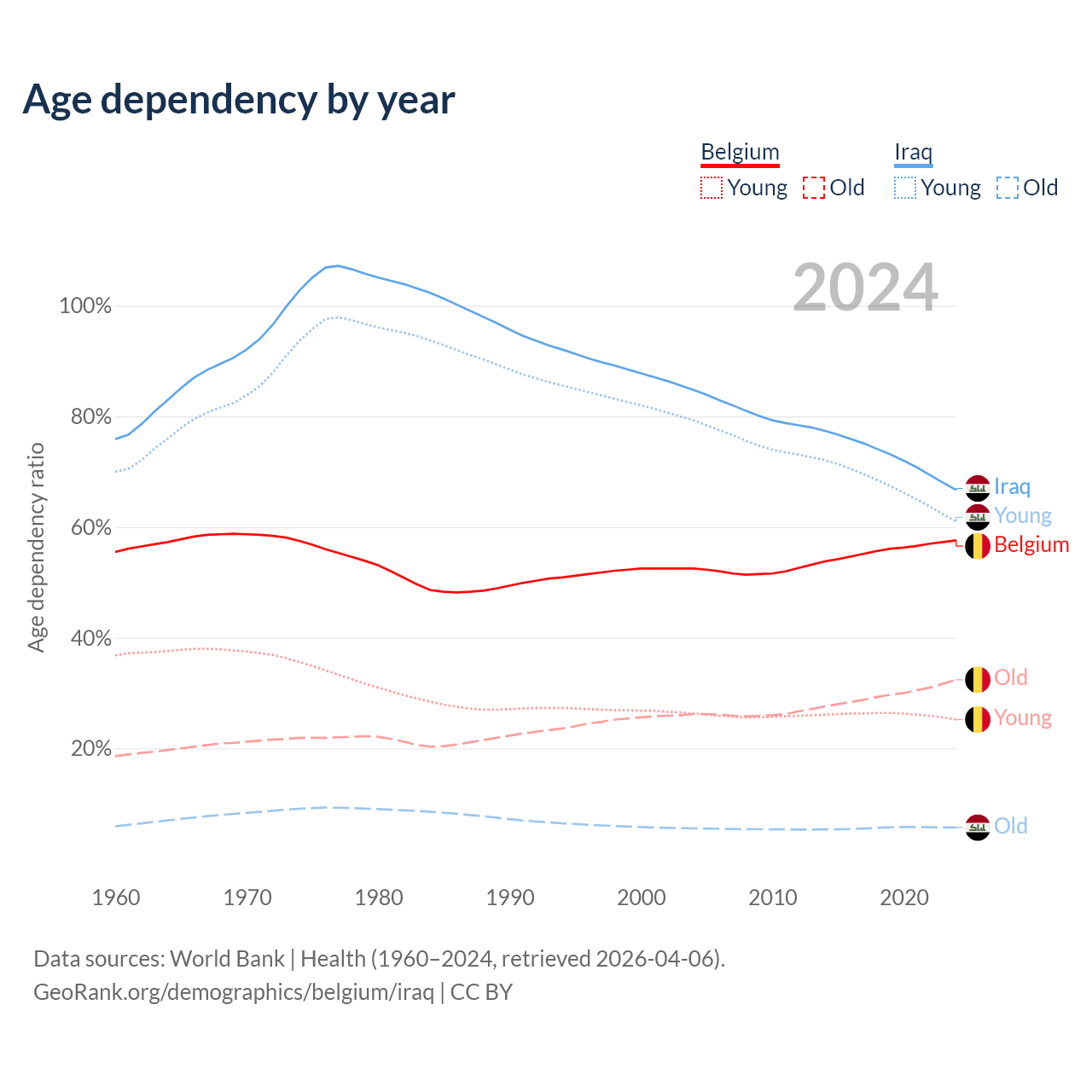 The share of older people aged 65 and over is 20.6% in Belgium and 3.41% in Iraq. Life expectancy in Belgium compared to Iraq .