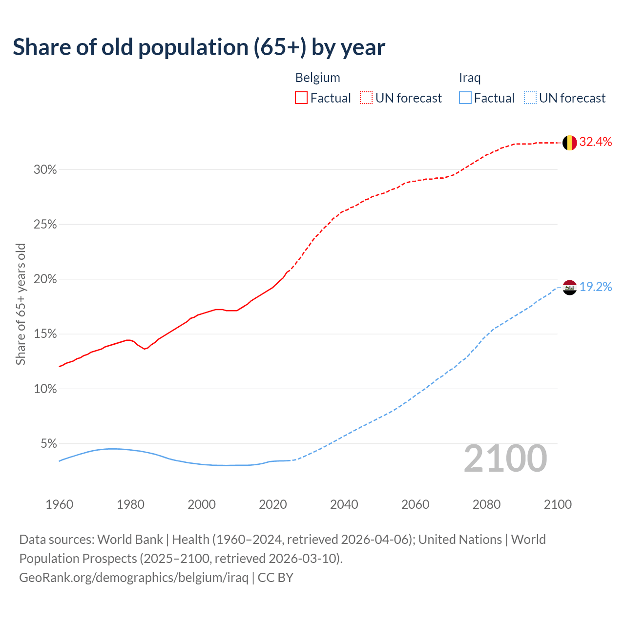 - The share of old-age demographic (65+) in Belgium is 20.6% vs 3.41% in Iraq.