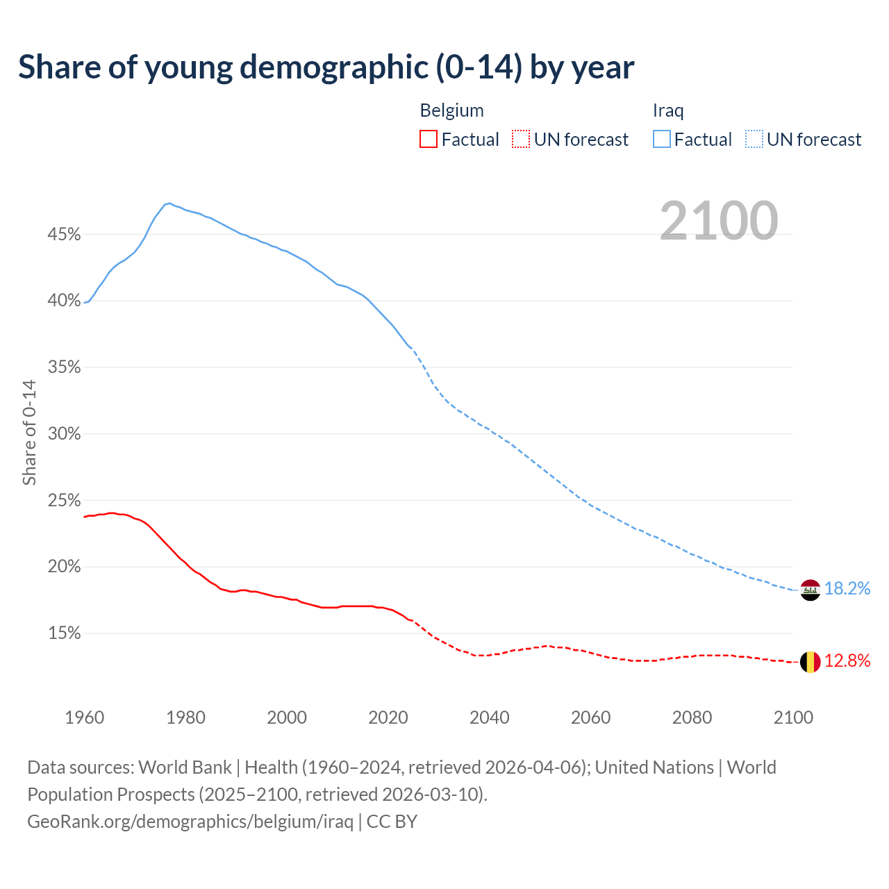 - The share of young demographic (0-15 years old) in Belgium is 16% vs 36.6% in Iraq.