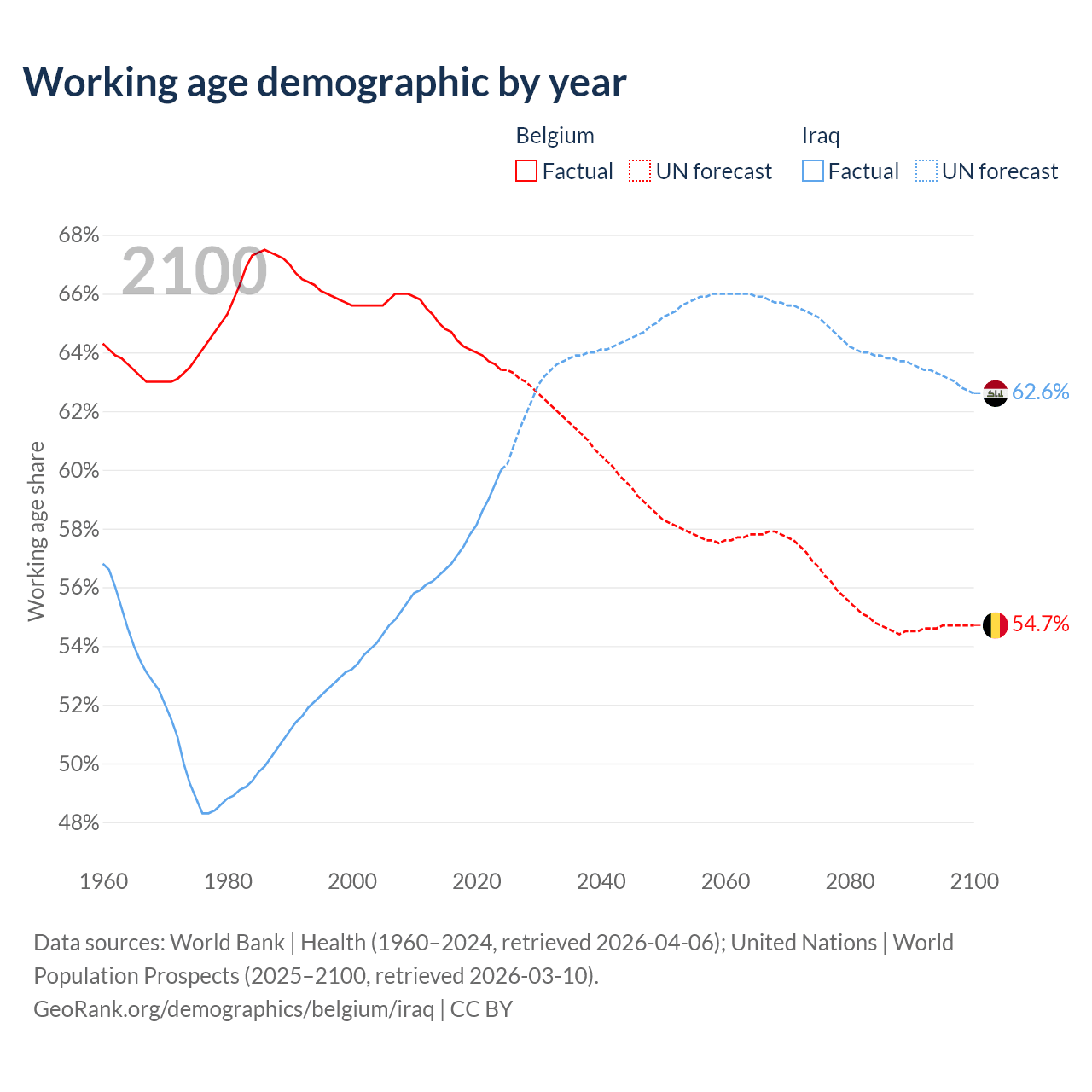 - Belgium has 7.55M working age adults (aged 15-64) vs 29M in Iraq.