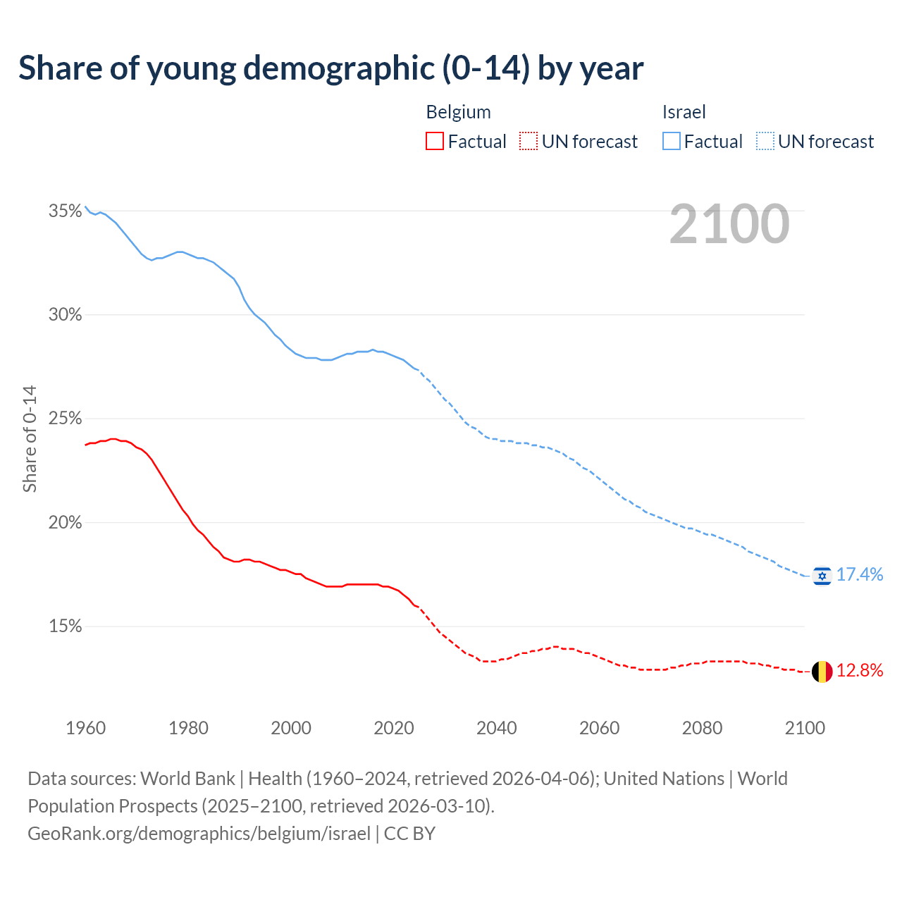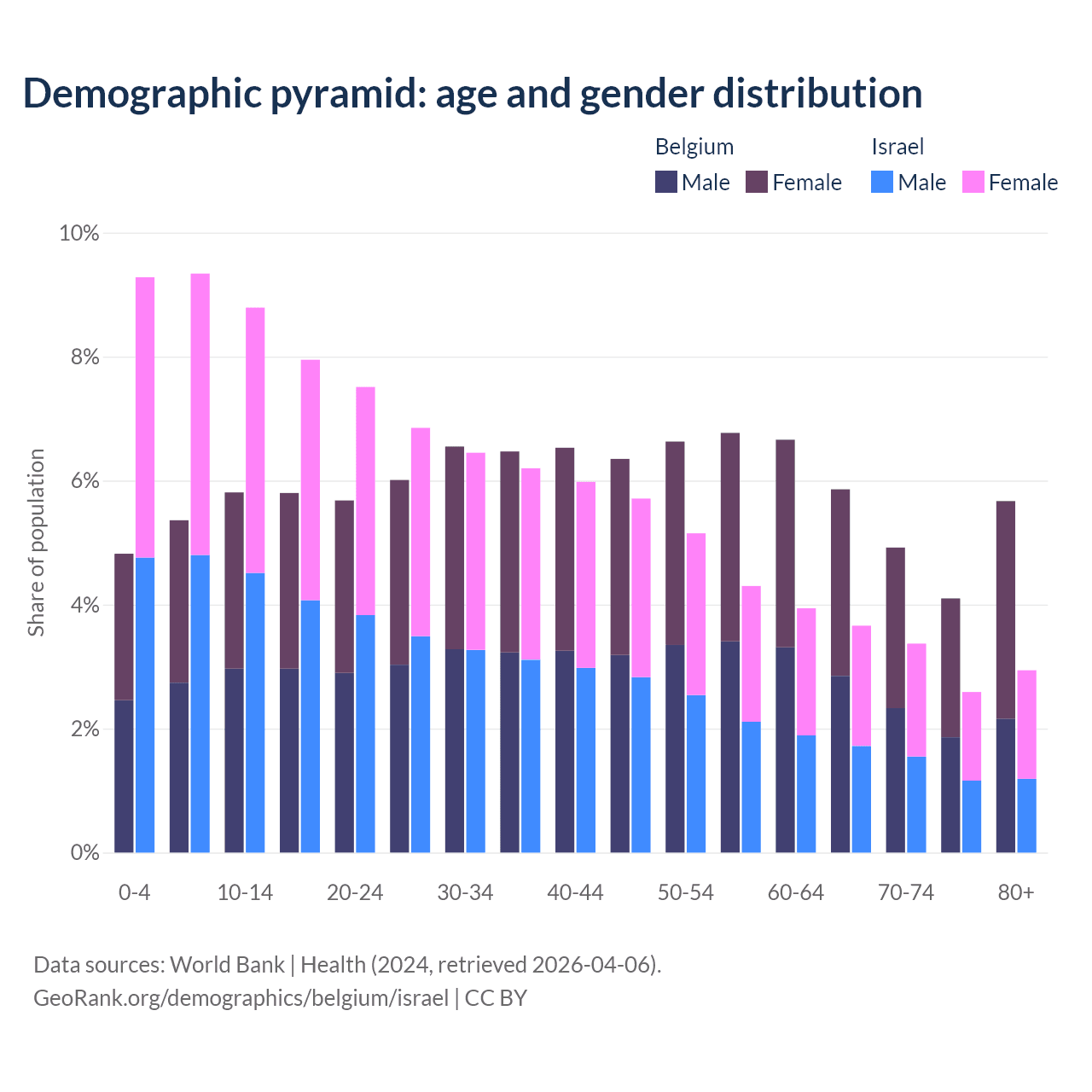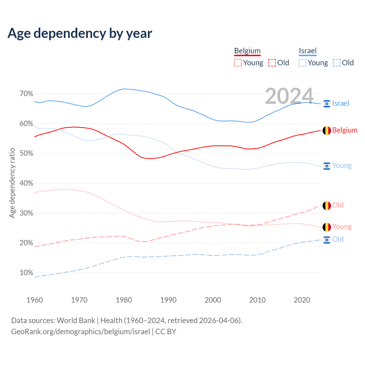 - Belgium is ranked 32/196 by median age (oldest to youngest) vs 103/196 for Israel.