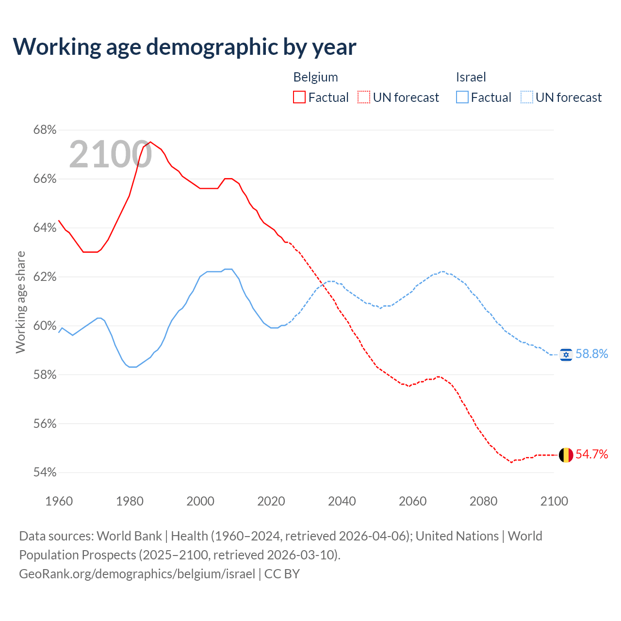 - Belgium has 7.55M working age adults (aged 15-64) vs 6.18M in Israel.