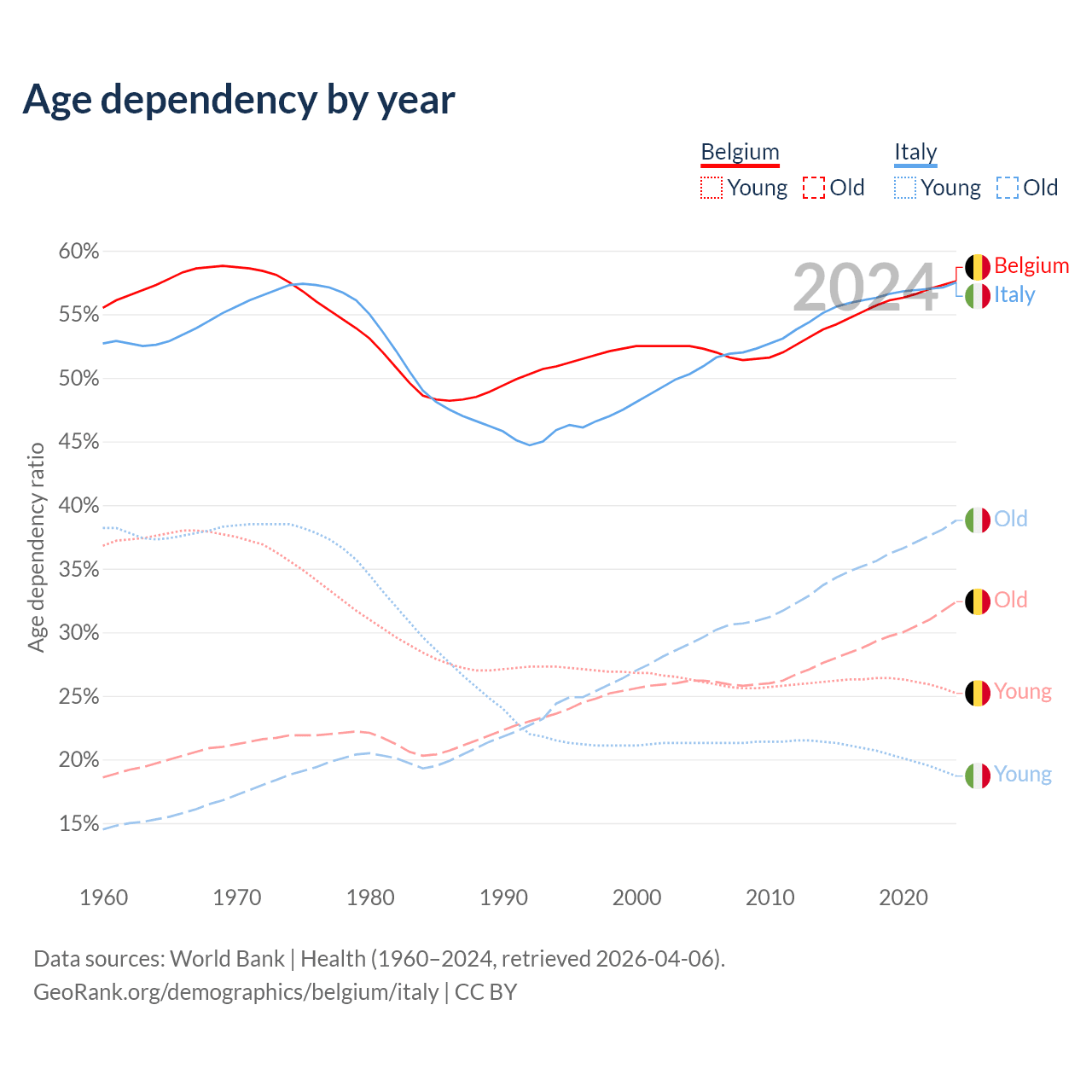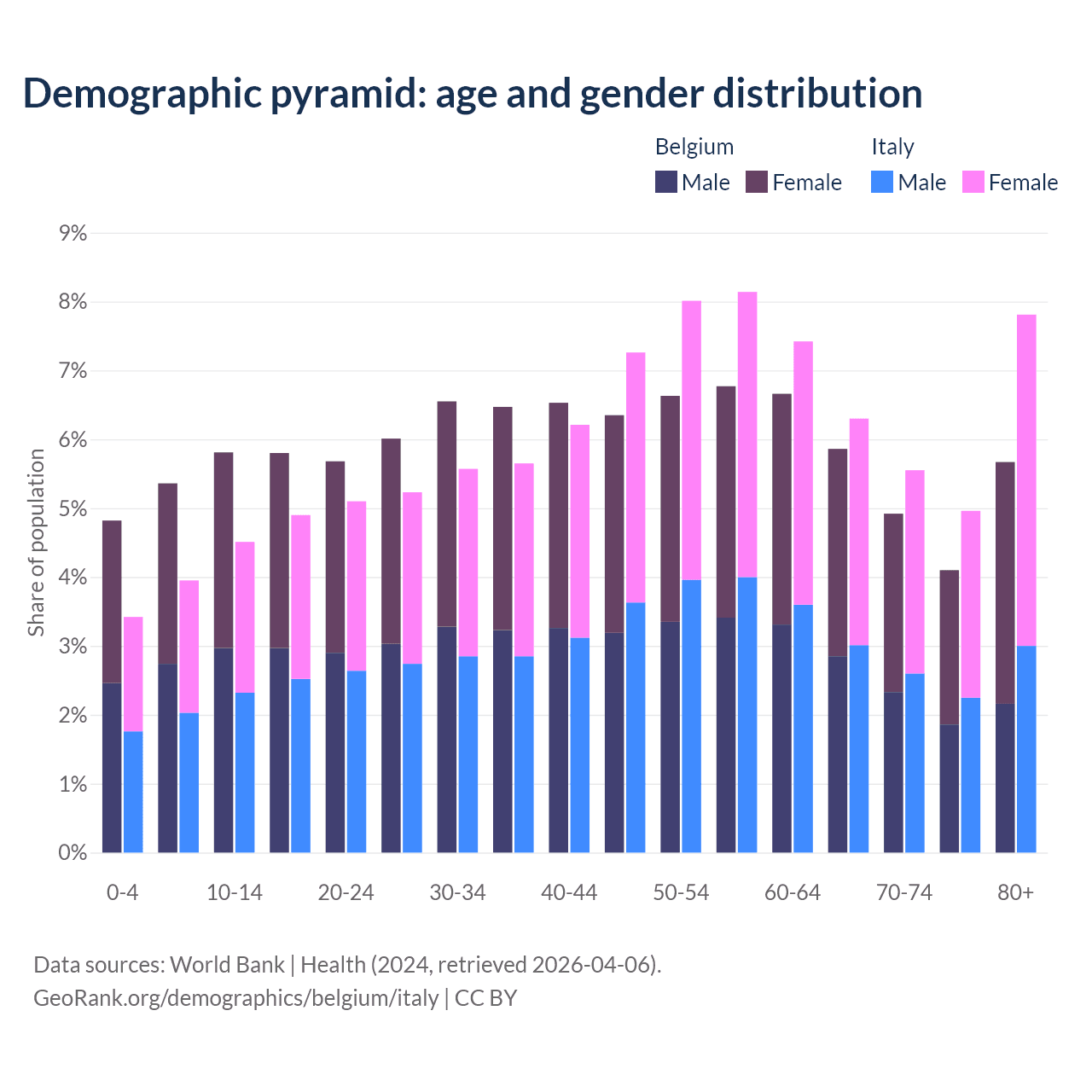 - Belgium is ranked 32/196 by median age (oldest to youngest) vs 4/196 for Italy.