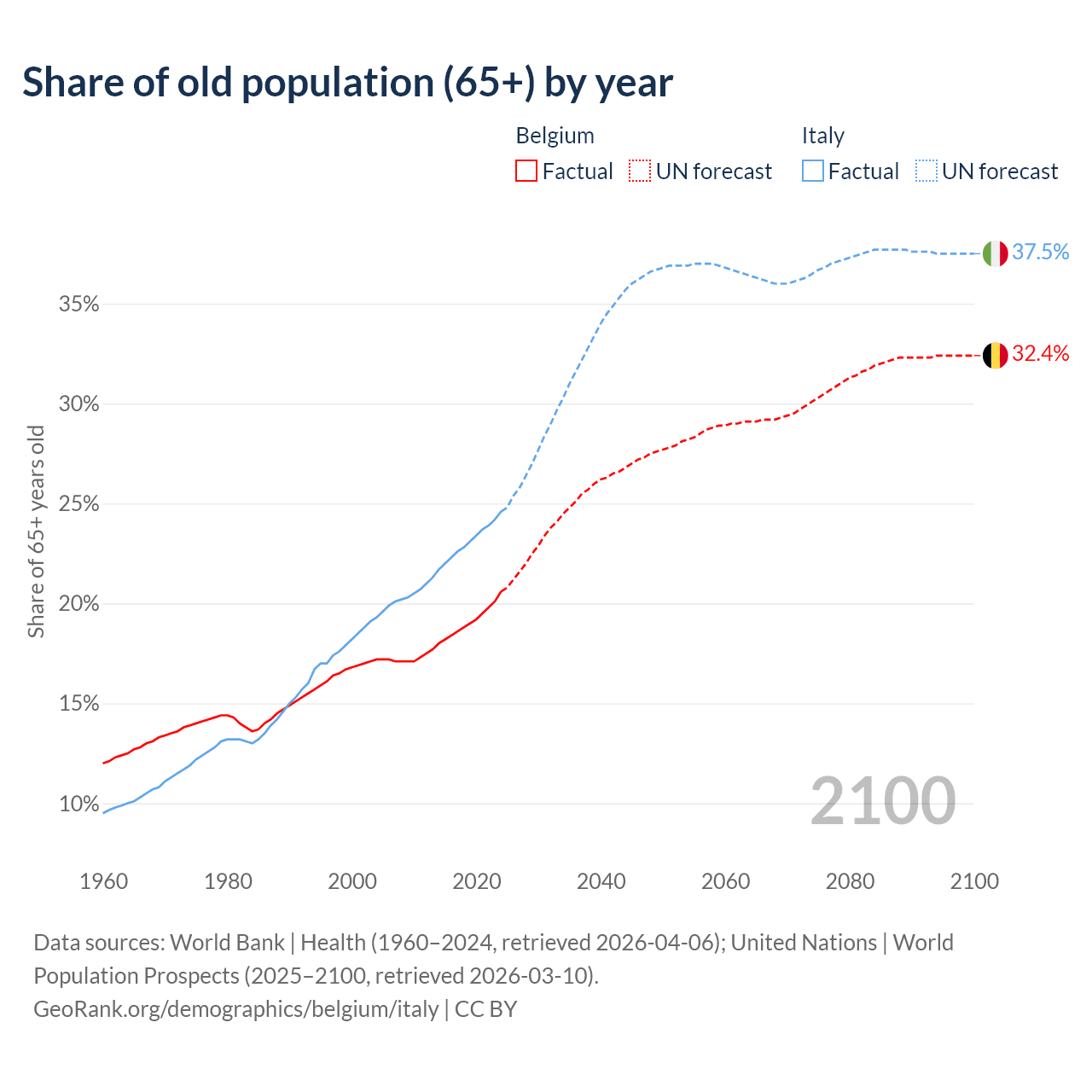 The share of older people aged 65 and over is 20.6% in Belgium and 24.6% in Italy. Life expectancy in Belgium compared to Italy .