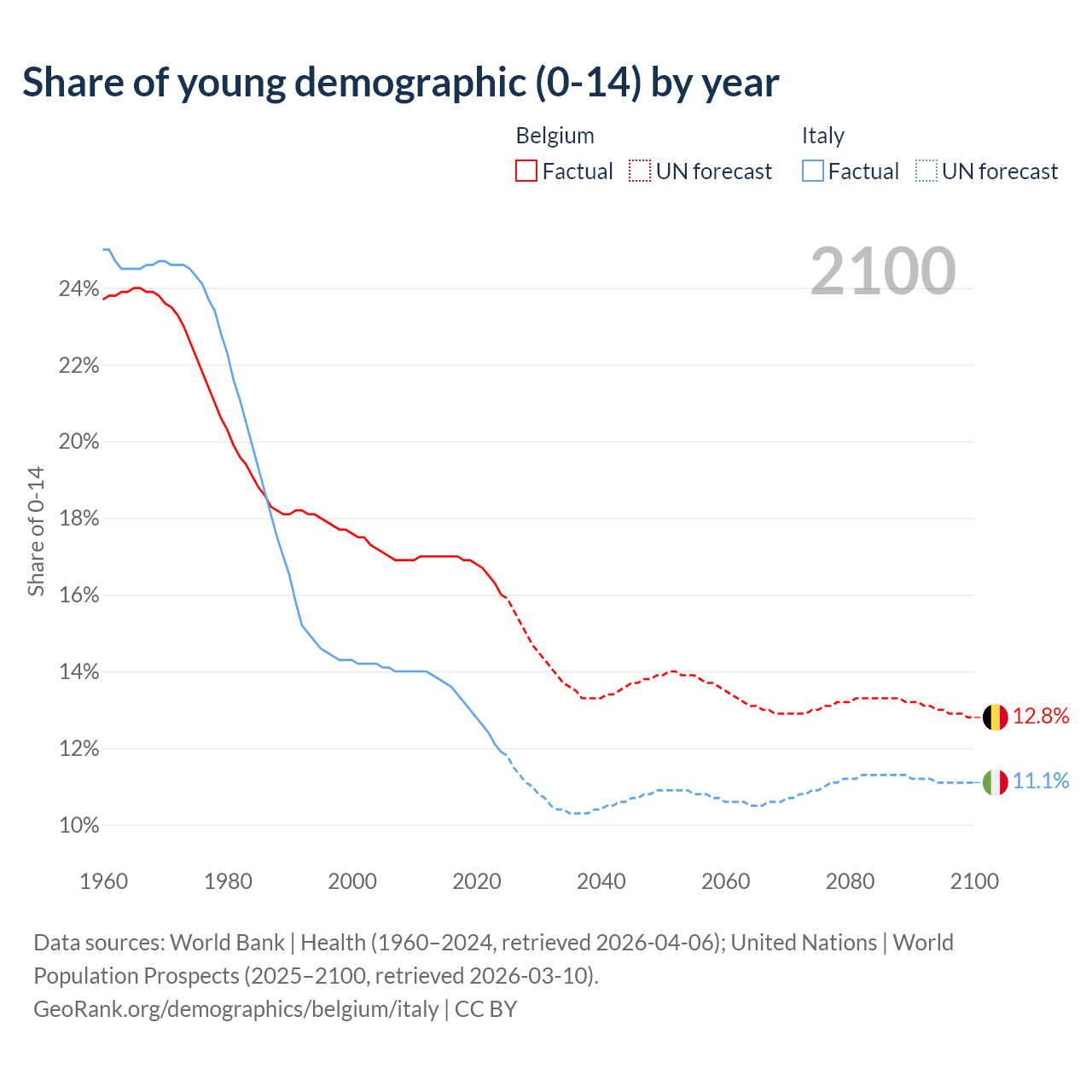 - The share of young demographic (0-15 years old) in Belgium is 16% vs 11.9% in Italy.