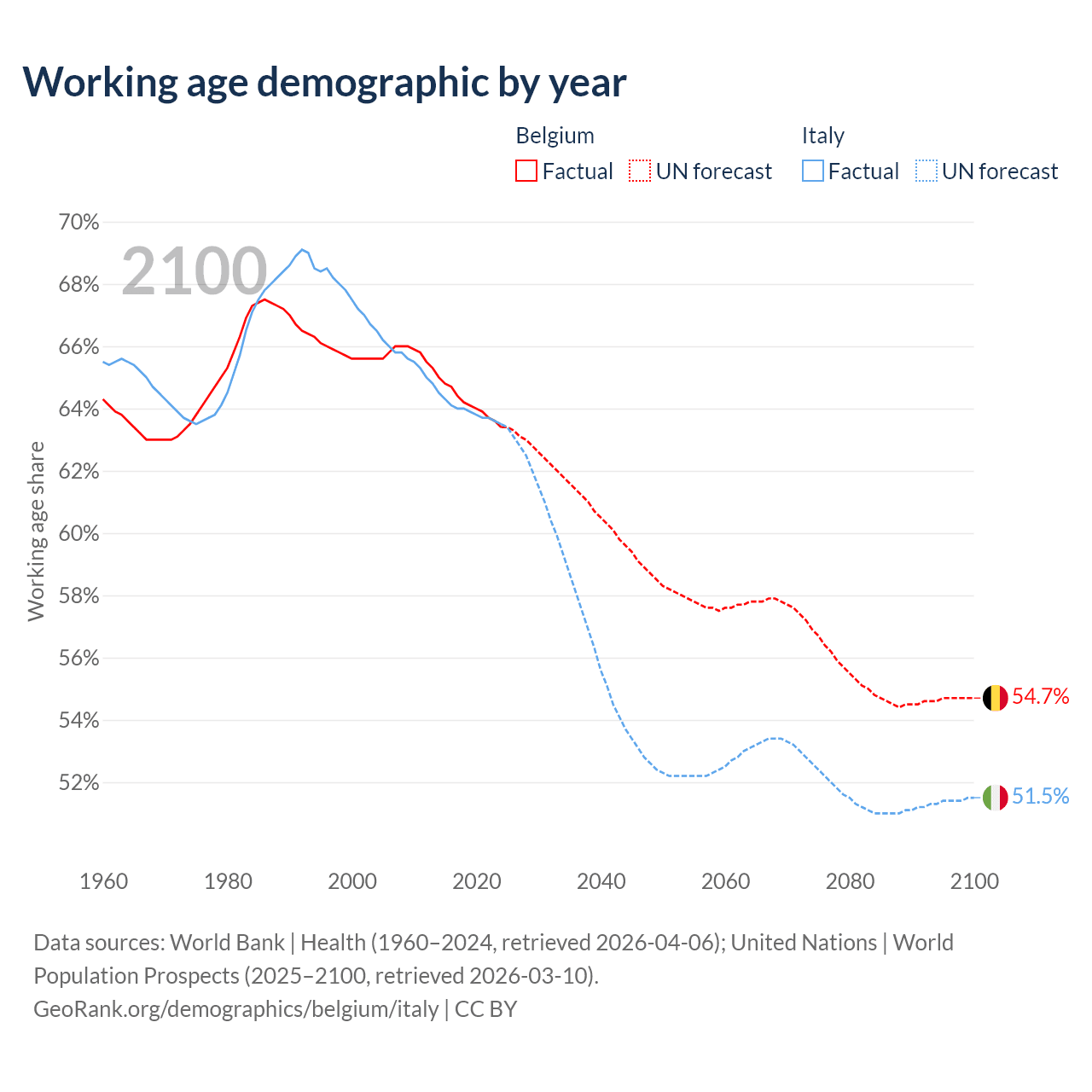 - Belgium has 7.55M working age adults (aged 15-64) vs 37.2M in Italy.