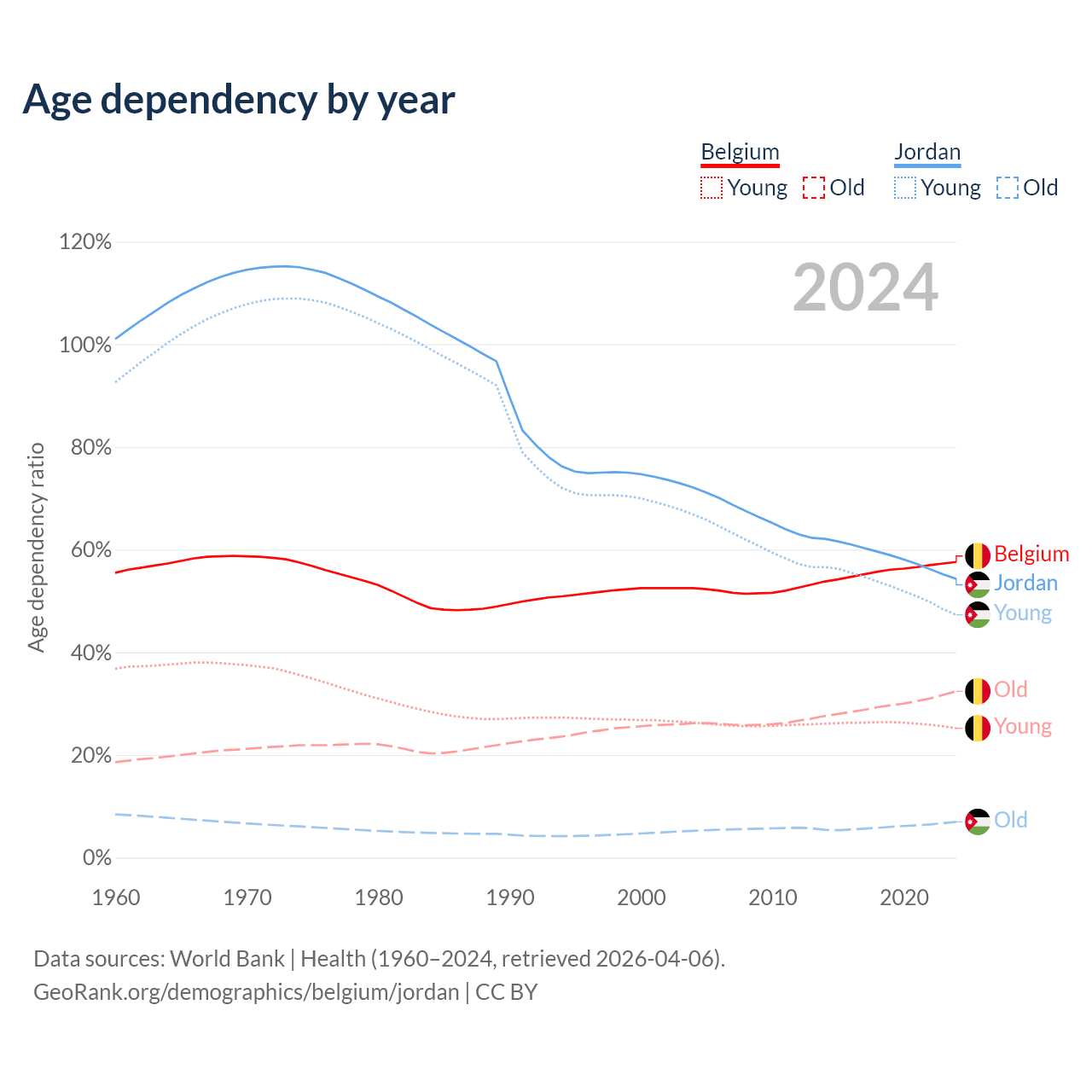- Belgium is ranked 32/196 by median age (oldest to youngest) vs 131/196 for Jordan.