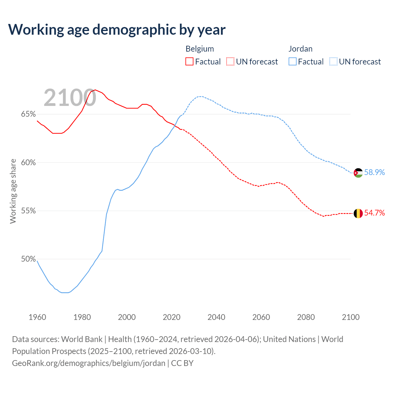 - Belgium has 7.55M working age adults (aged 15-64) vs 7.49M in Jordan.