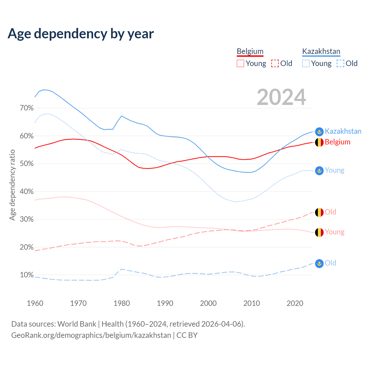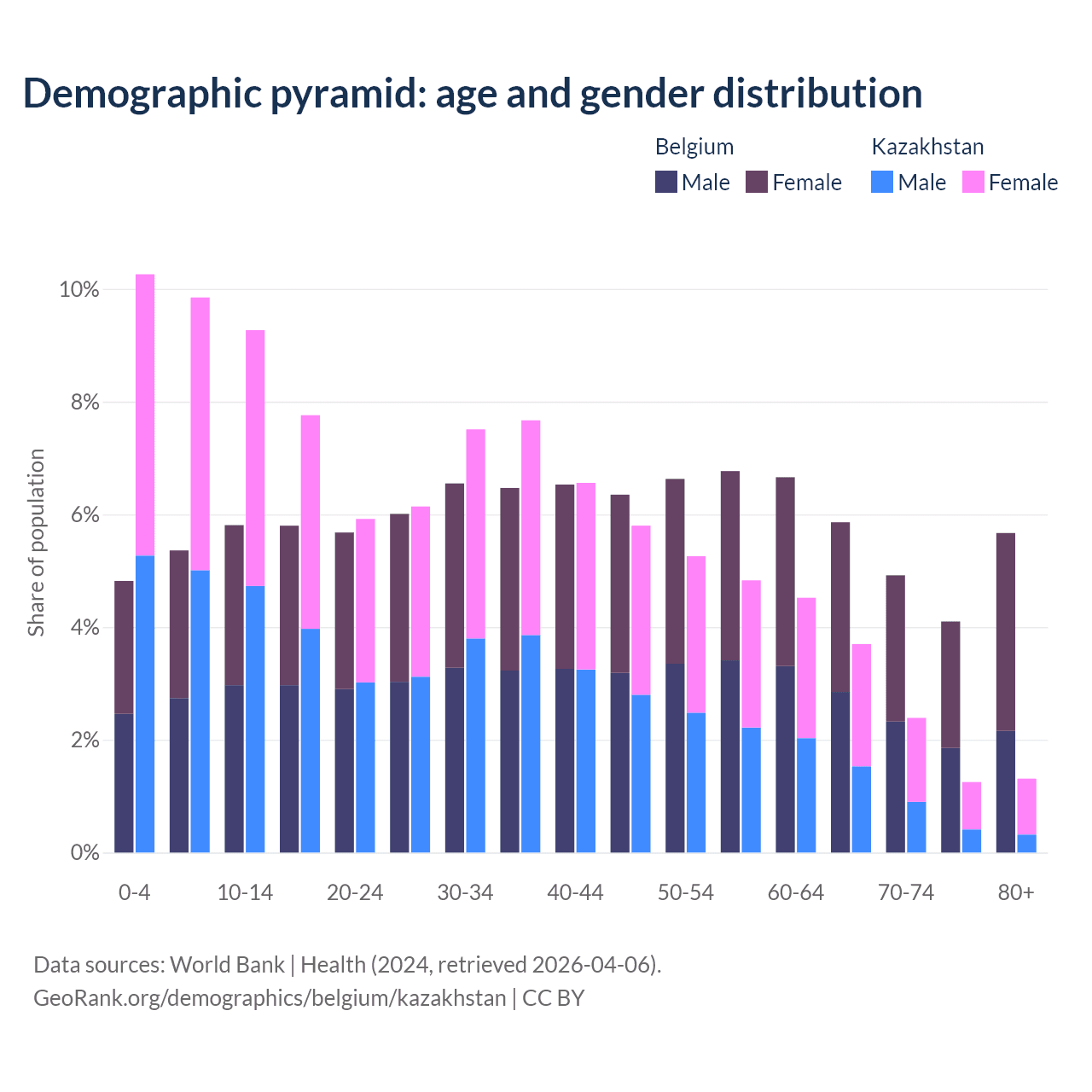 - Belgium is ranked 32/196 by median age (oldest to youngest) vs 99/196 for Kazakhstan.