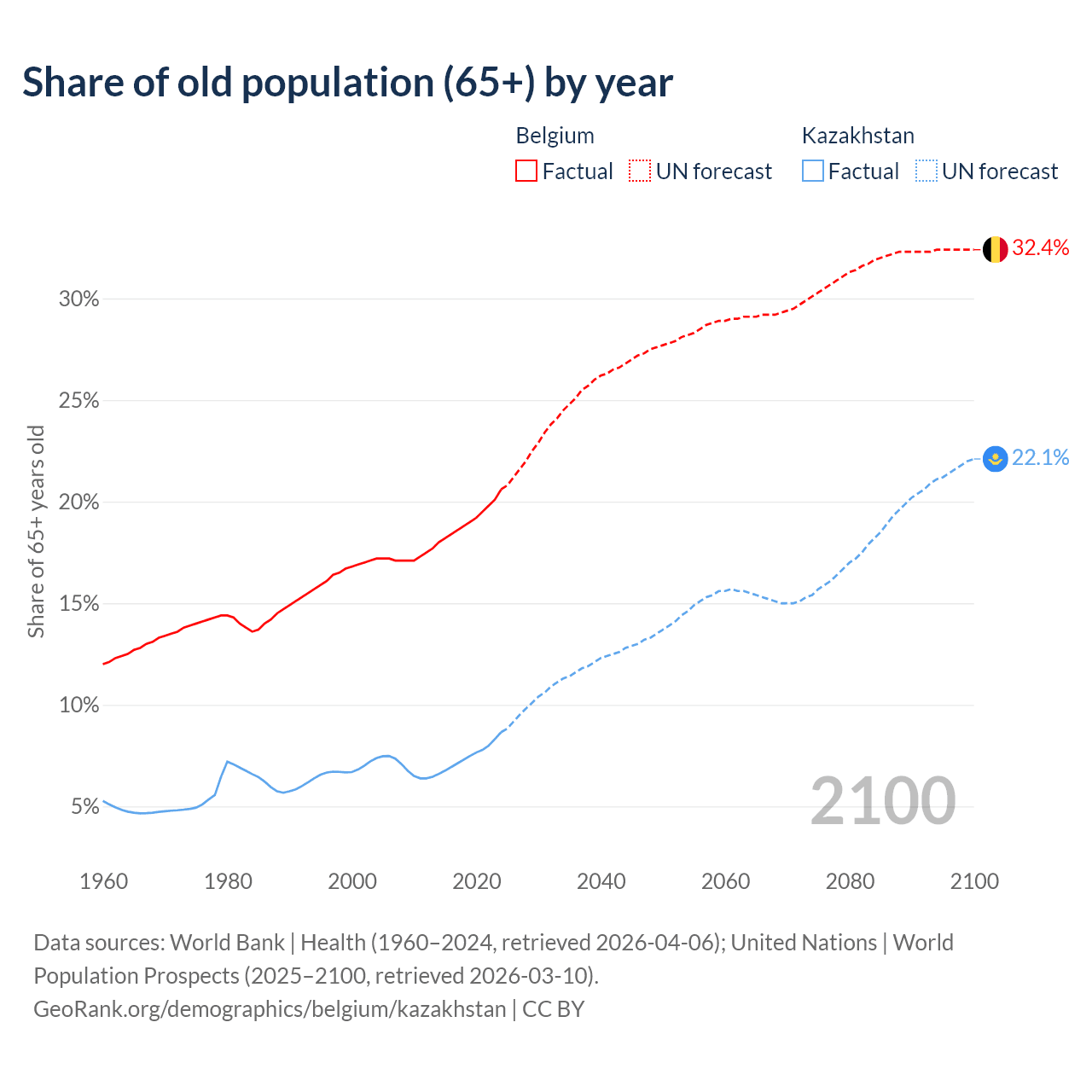 - The share of old-age demographic (65+) in Belgium is 20.6% vs 8.65% in Kazakhstan.