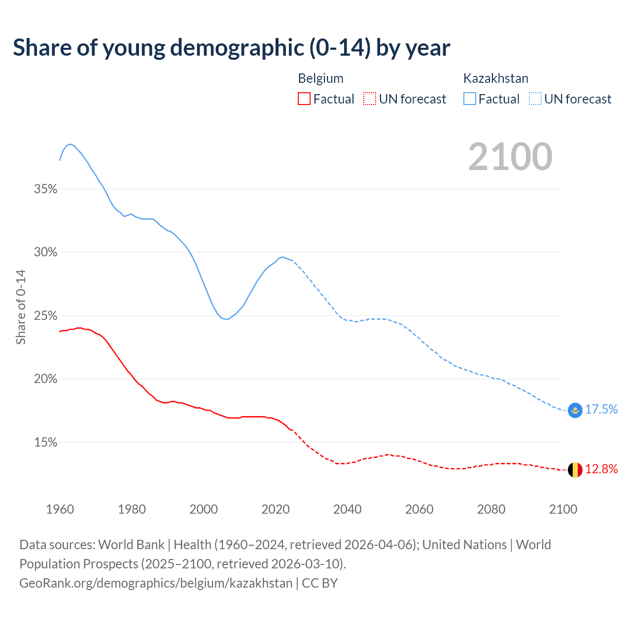 - The share of young demographic (0-15 years old) in Belgium is 16% vs 29.4% in Kazakhstan.