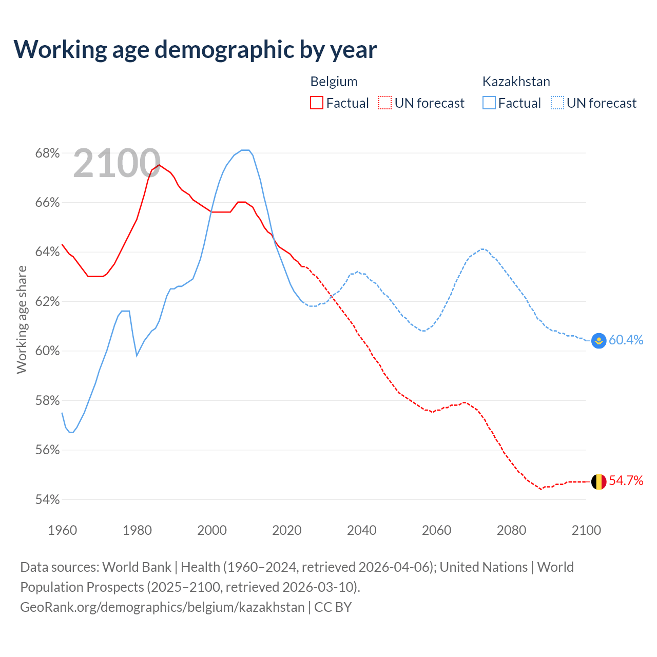 - Belgium has 7.55M working age adults (aged 15-64) vs 13.1M in Kazakhstan.