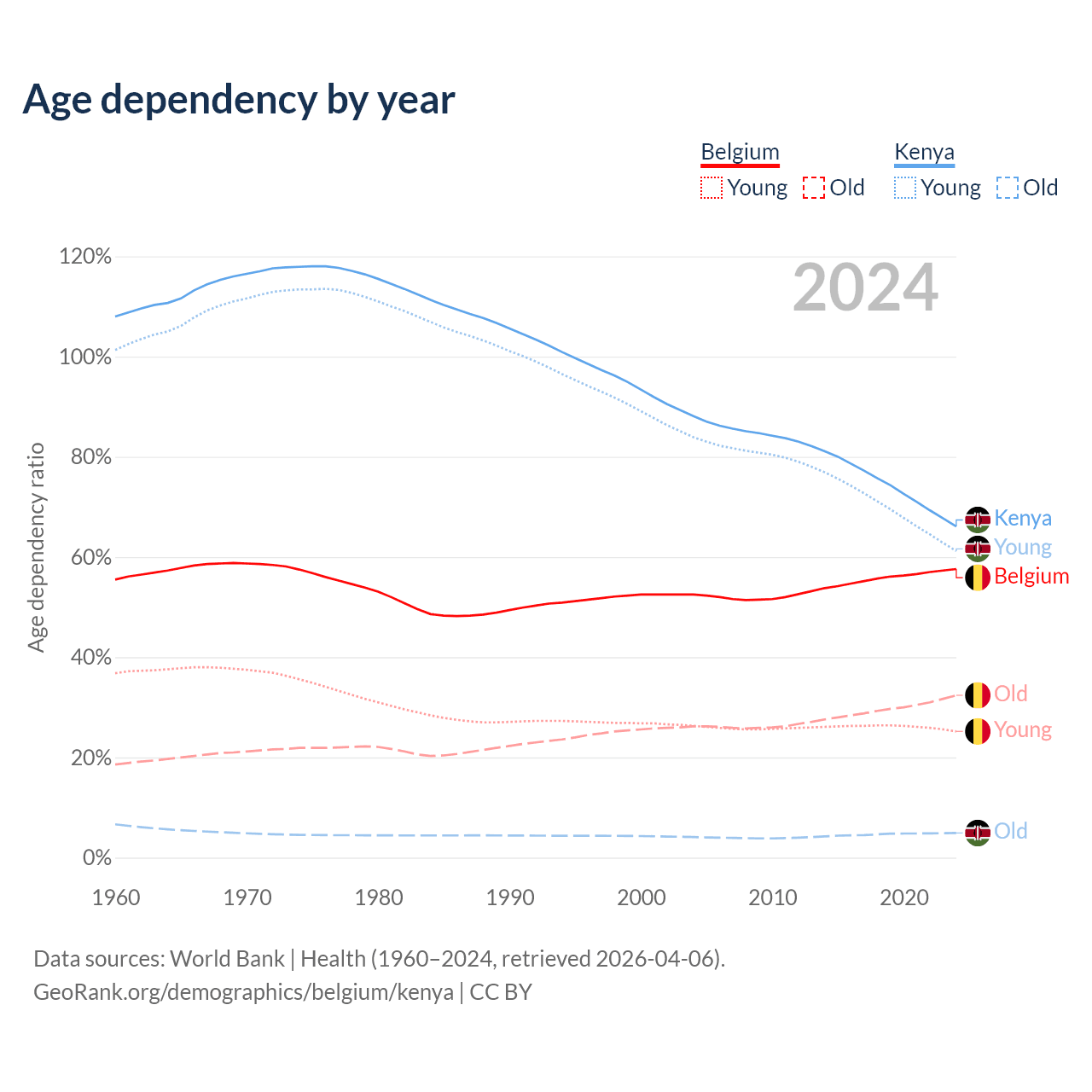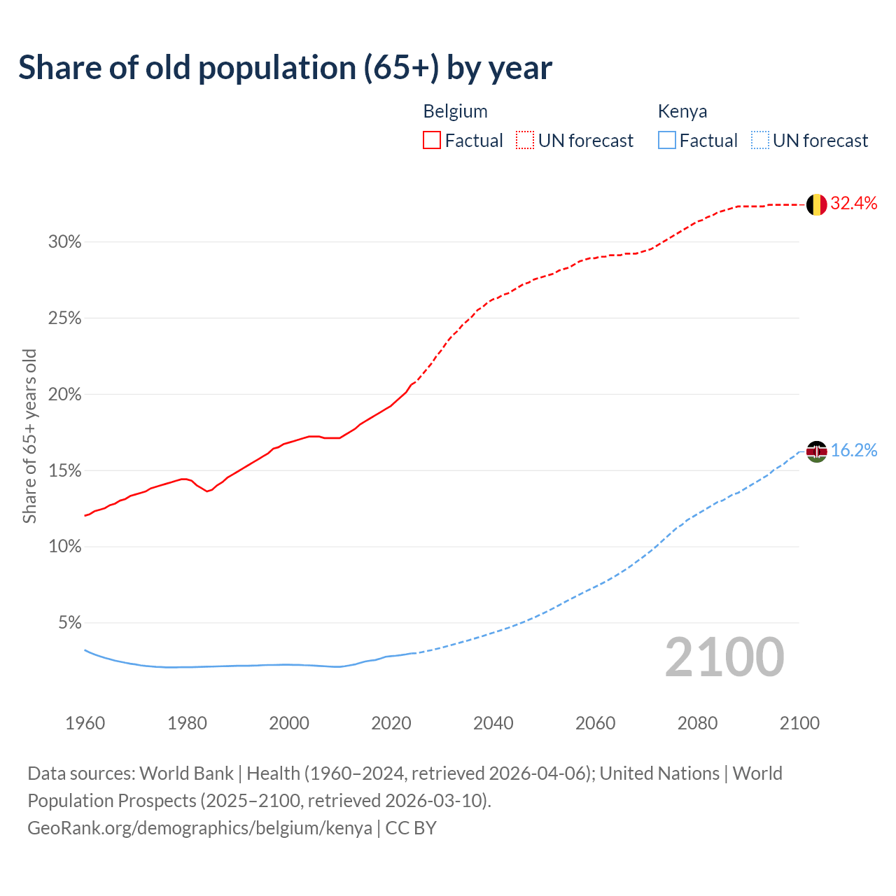 The share of older people aged 65 and over is 20.6% in Belgium and 2.97% in Kenya. Life expectancy in Belgium compared to Kenya .