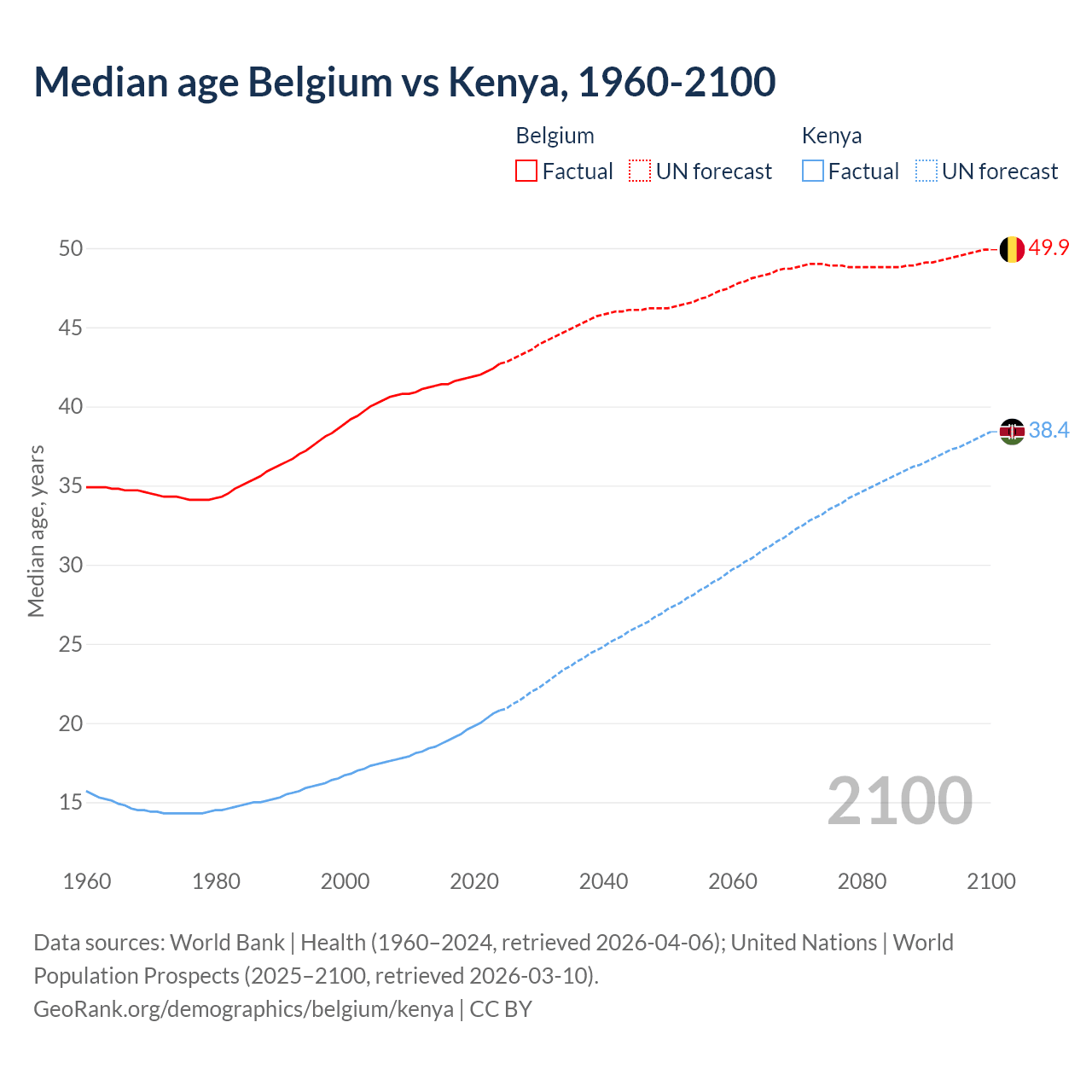 - The median age in Belgium is 42.7 years compared to 20.8 years in Kenya.