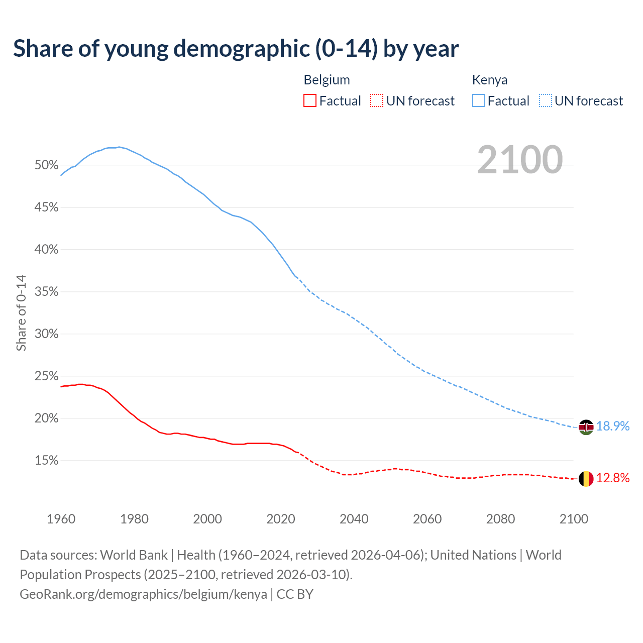 - The share of young demographic (0-15 years old) in Belgium is 16% vs 36.8% in Kenya.