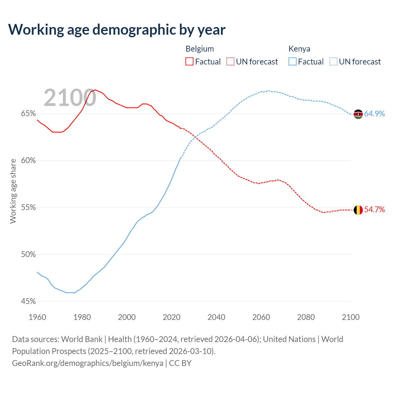- Belgium has 7.55M working age adults (aged 15-64) vs 35.5M in Kenya.