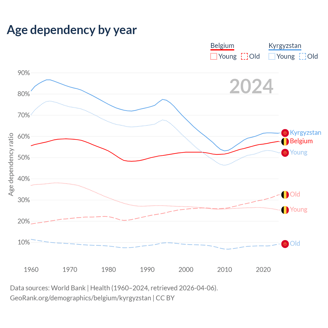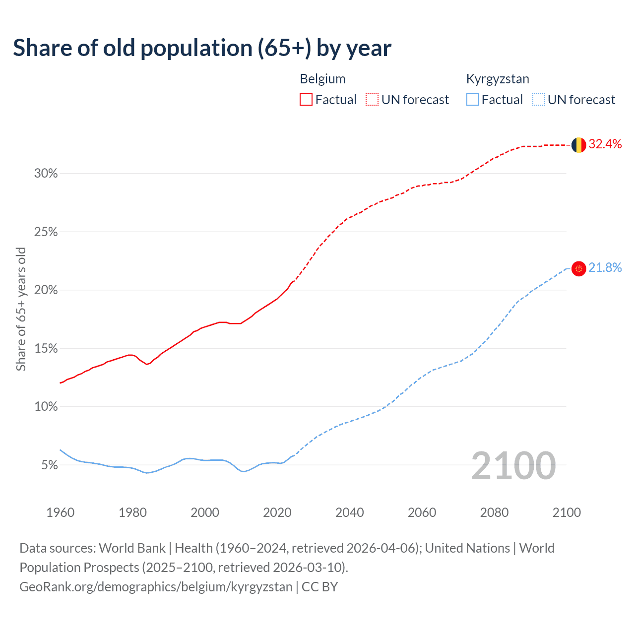 - The share of old-age demographic (65+) in Belgium is 20.6% vs 5.68% in Kyrgyzstan.