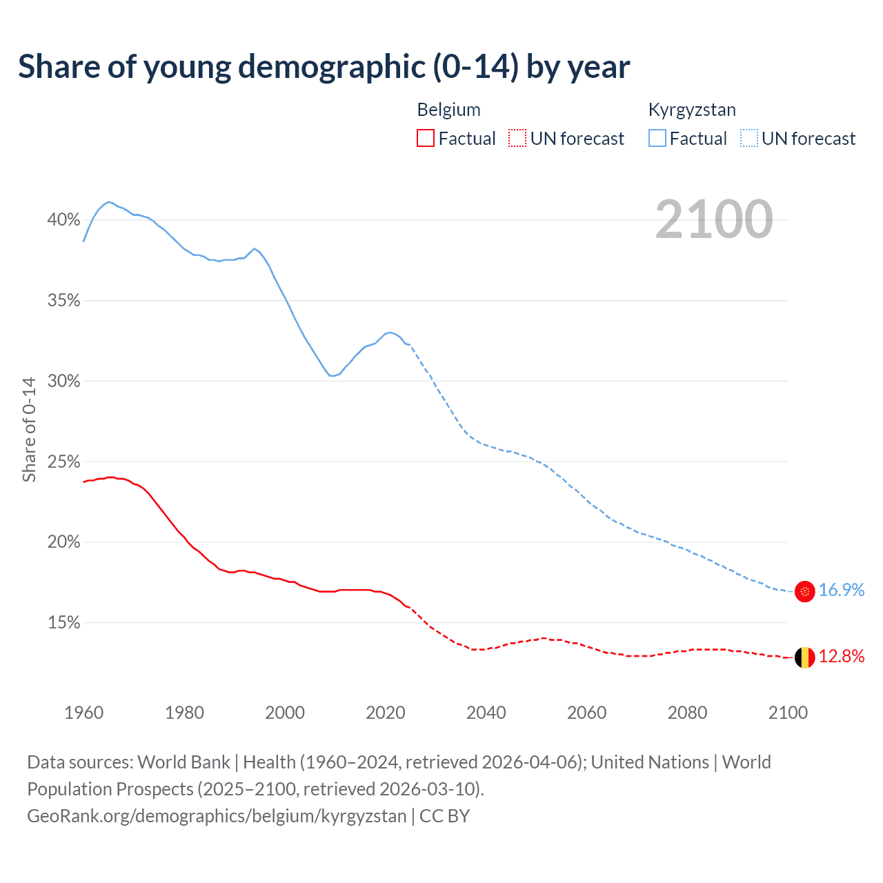 - The share of young demographic (0-15 years old) in Belgium is 16% vs 32.3% in Kyrgyzstan.