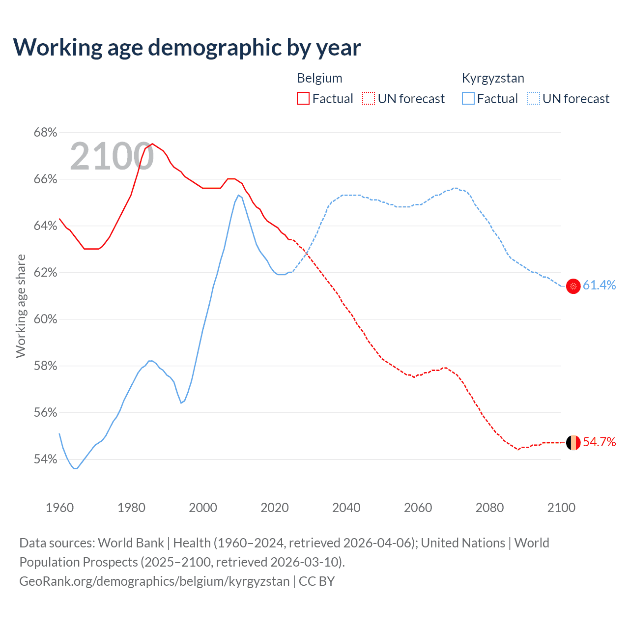 Median age Belgium vs Kyrgyzstan, 1960-2100