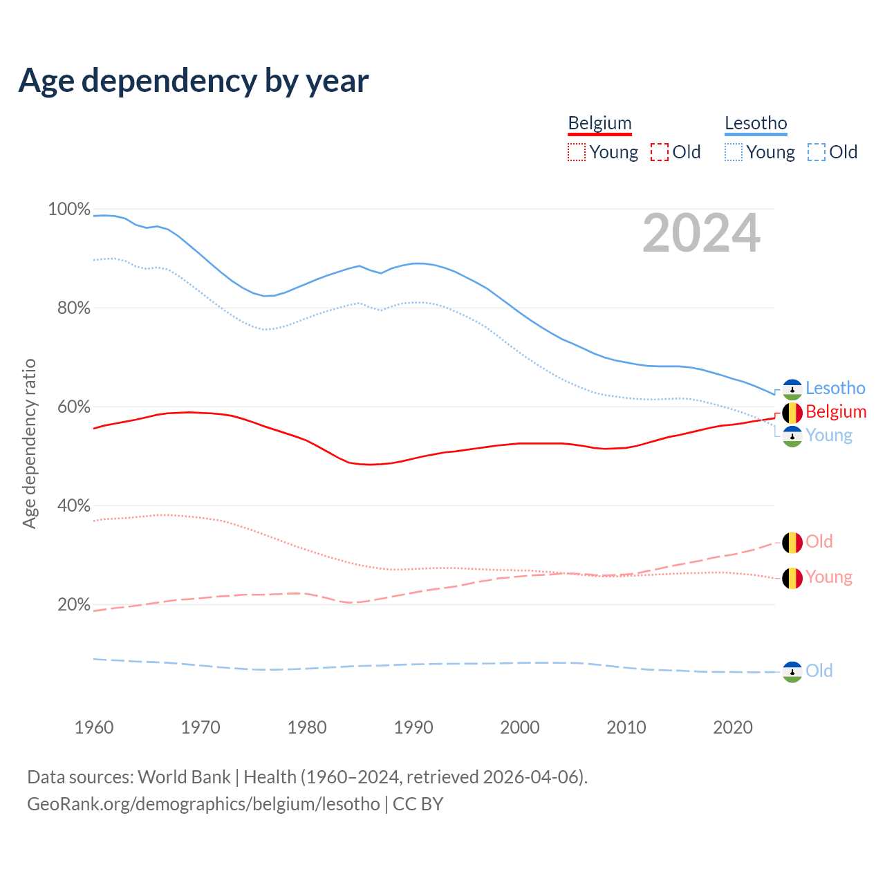 - Belgium is ranked 32/196 by median age (oldest to youngest) vs 143/196 for Lesotho.