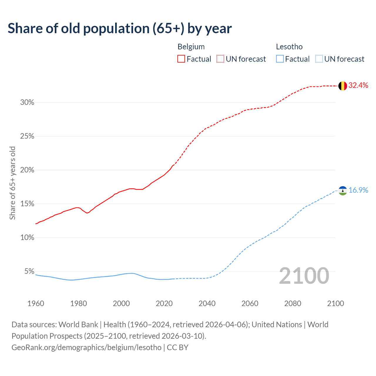 The share of older people aged 65 and over is 20.6% in Belgium and 3.86% in Lesotho. Life expectancy in Belgium compared to Lesotho .