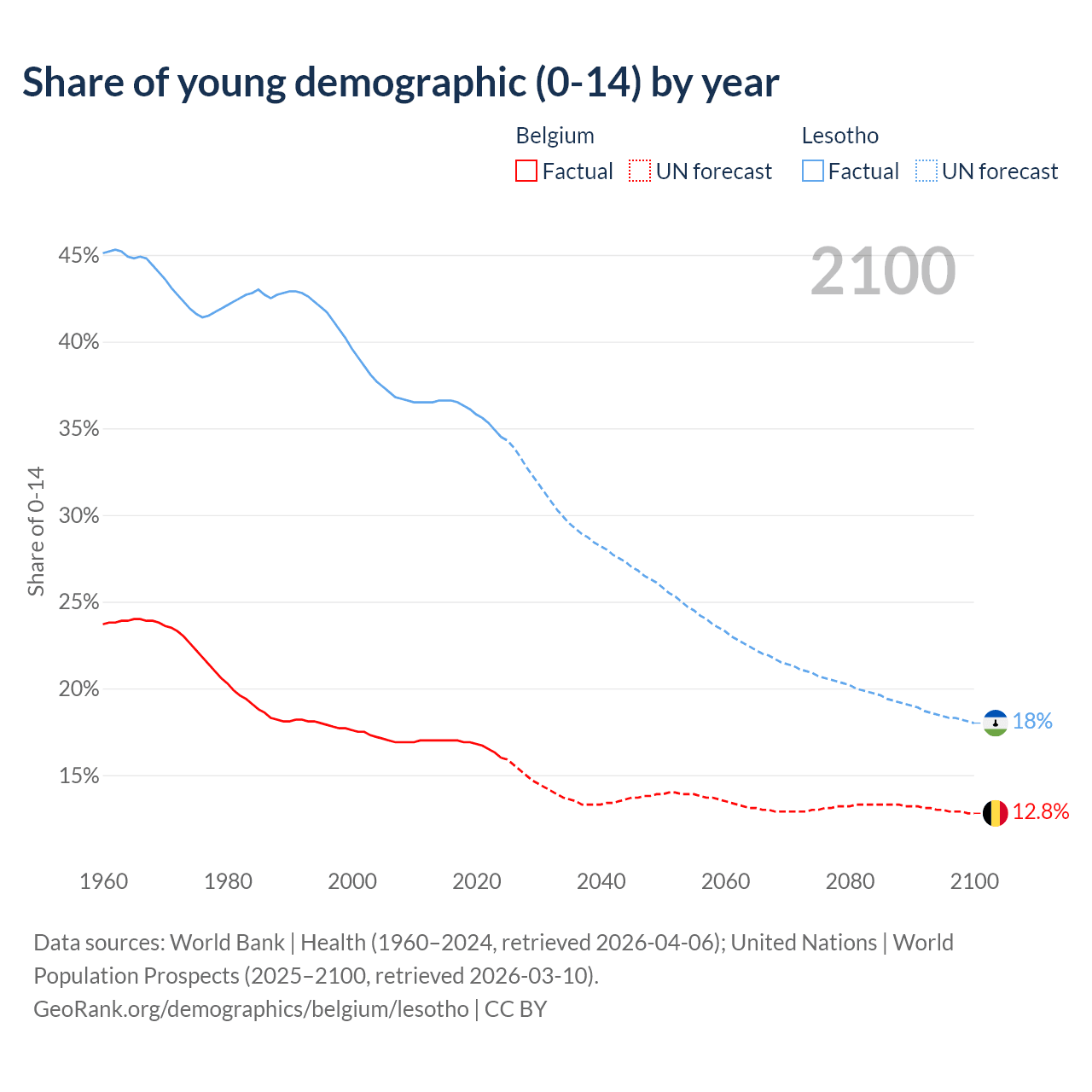 - The share of young demographic (0-15 years old) in Belgium is 16% vs 34.5% in Lesotho.