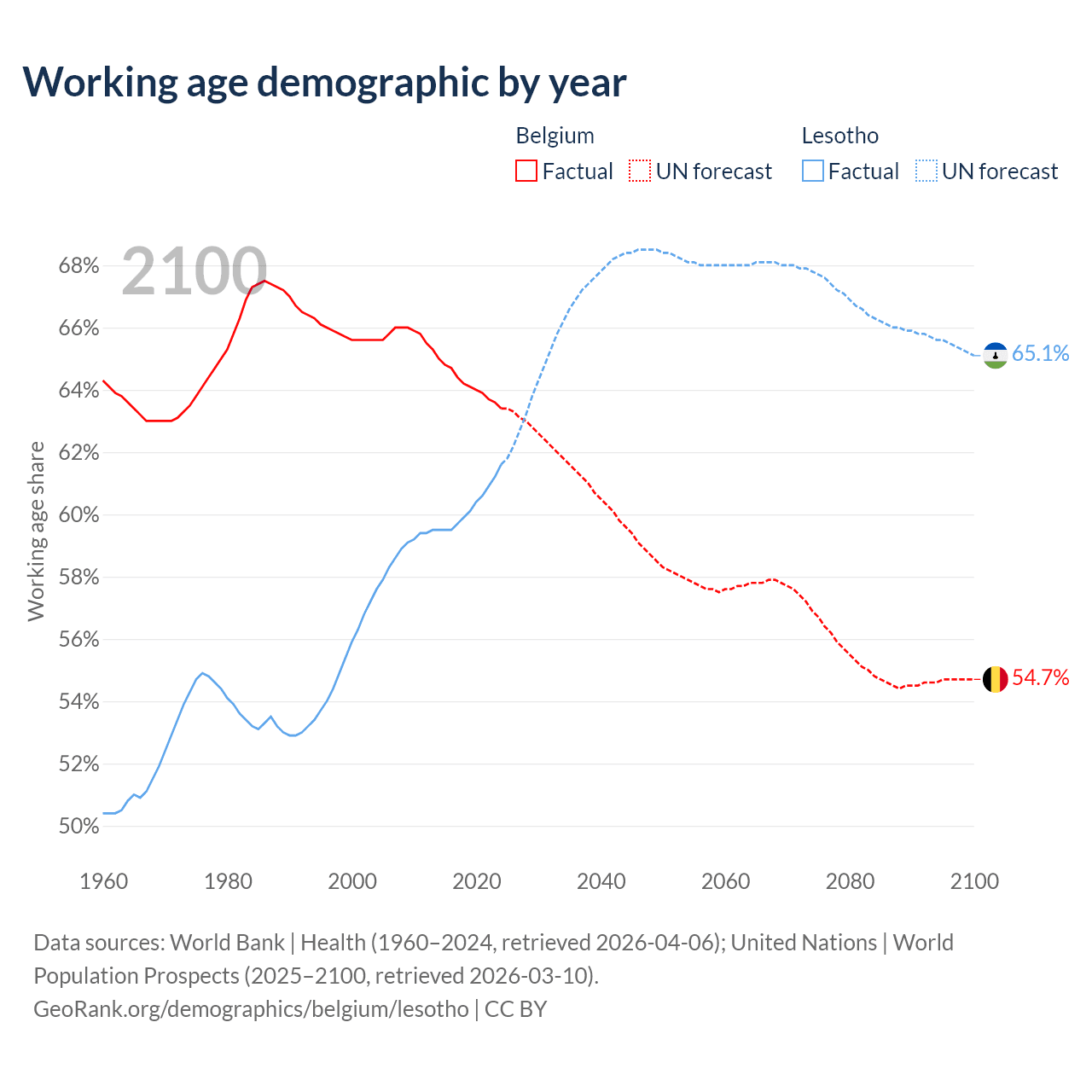 - Belgium has 7.55M working age adults (aged 15-64) vs 1.48M in Lesotho.