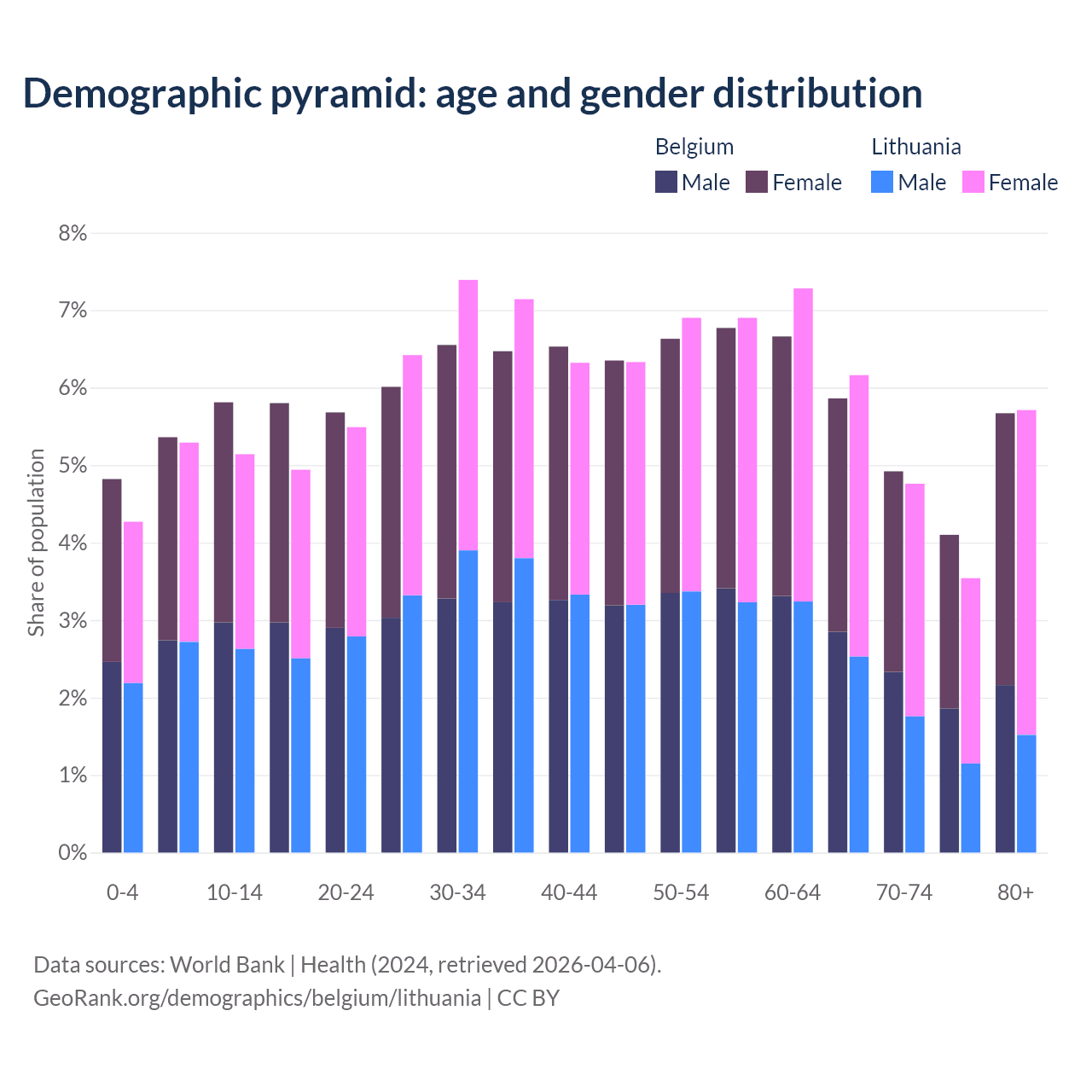 - As of 2026, the population of Belgium is 11.9M vs 2.83M in Lithuania - 4.21 times difference.
