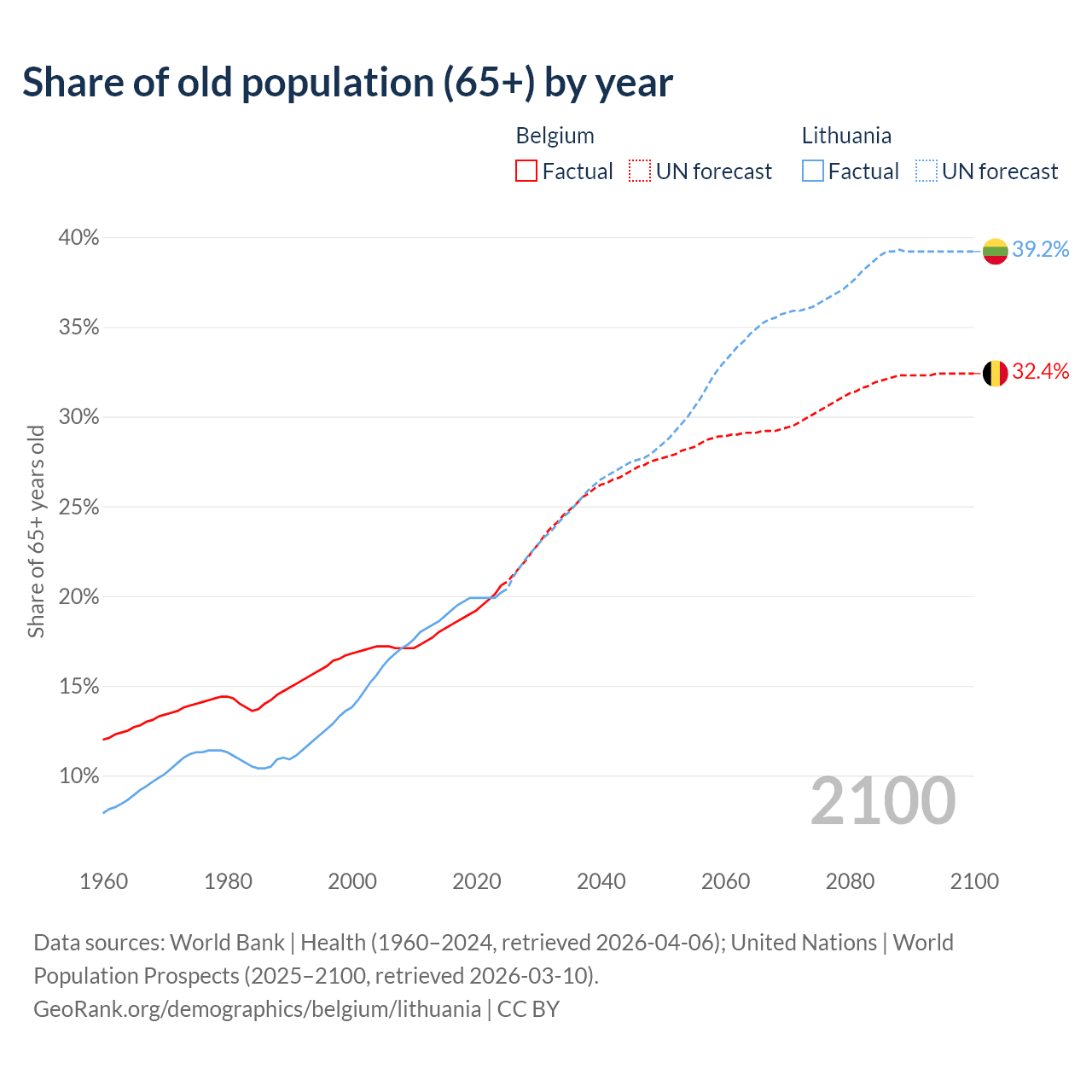 - The share of old-age demographic (65+) in Belgium is 20.6% vs 20.2% in Lithuania.