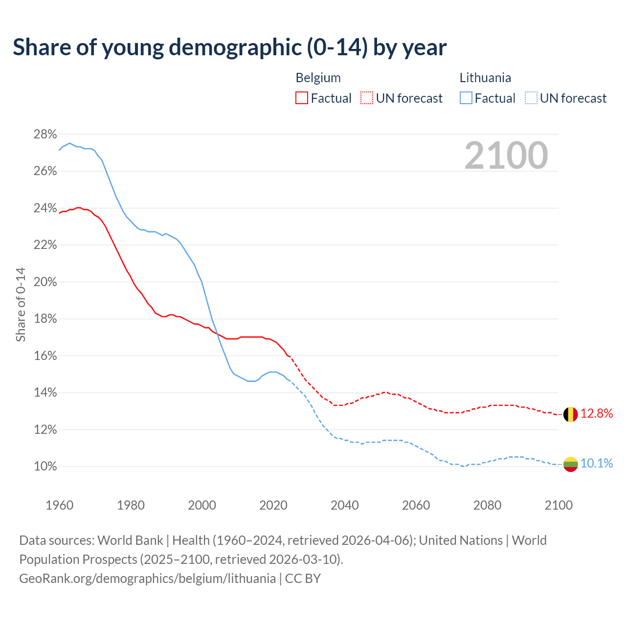 - The share of young demographic (0-15 years old) in Belgium is 16% vs 14.7% in Lithuania.