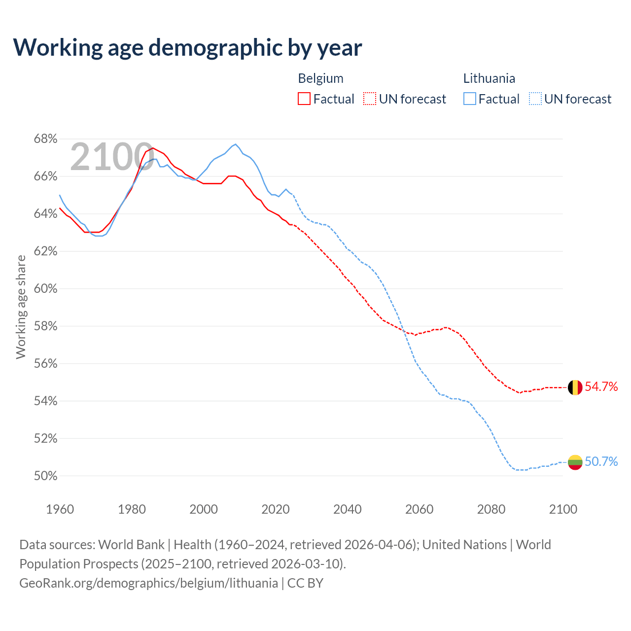 - Belgium has 7.55M working age adults (aged 15-64) vs 1.84M in Lithuania.