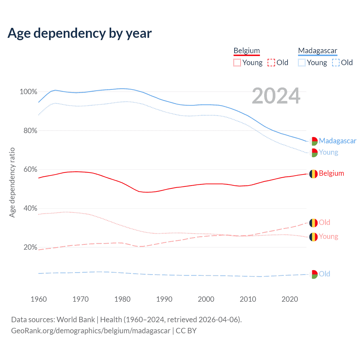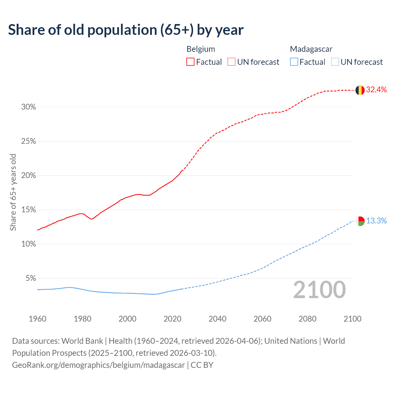 The share of older people aged 65 and over is 20.6% in Belgium and 3.41% in Madagascar. Life expectancy in Belgium compared to Madagascar .
