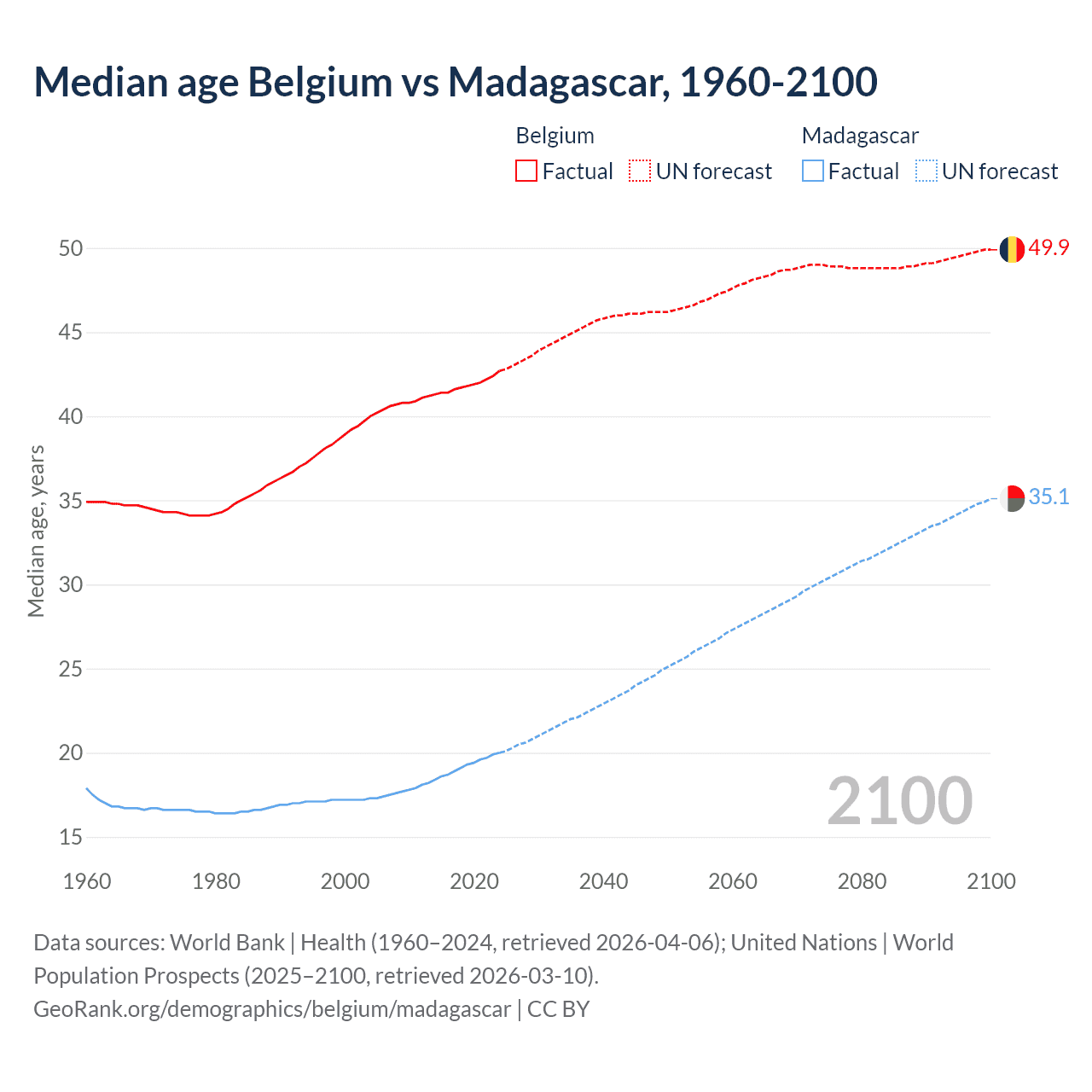 - The median age in Belgium is 42.7 years compared to 20 years in Madagascar.