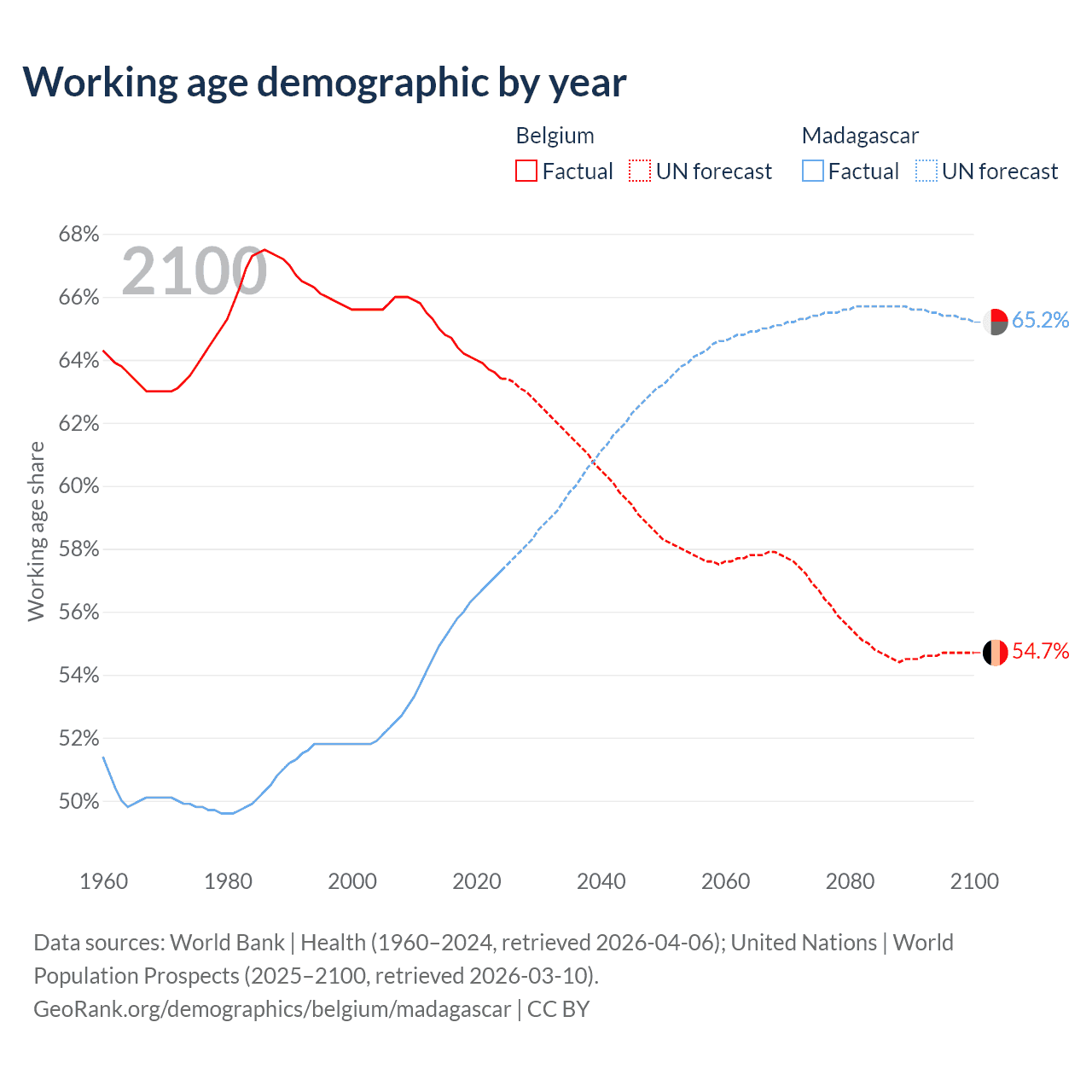 - Belgium has 7.55M working age adults (aged 15-64) vs 19.4M in Madagascar.