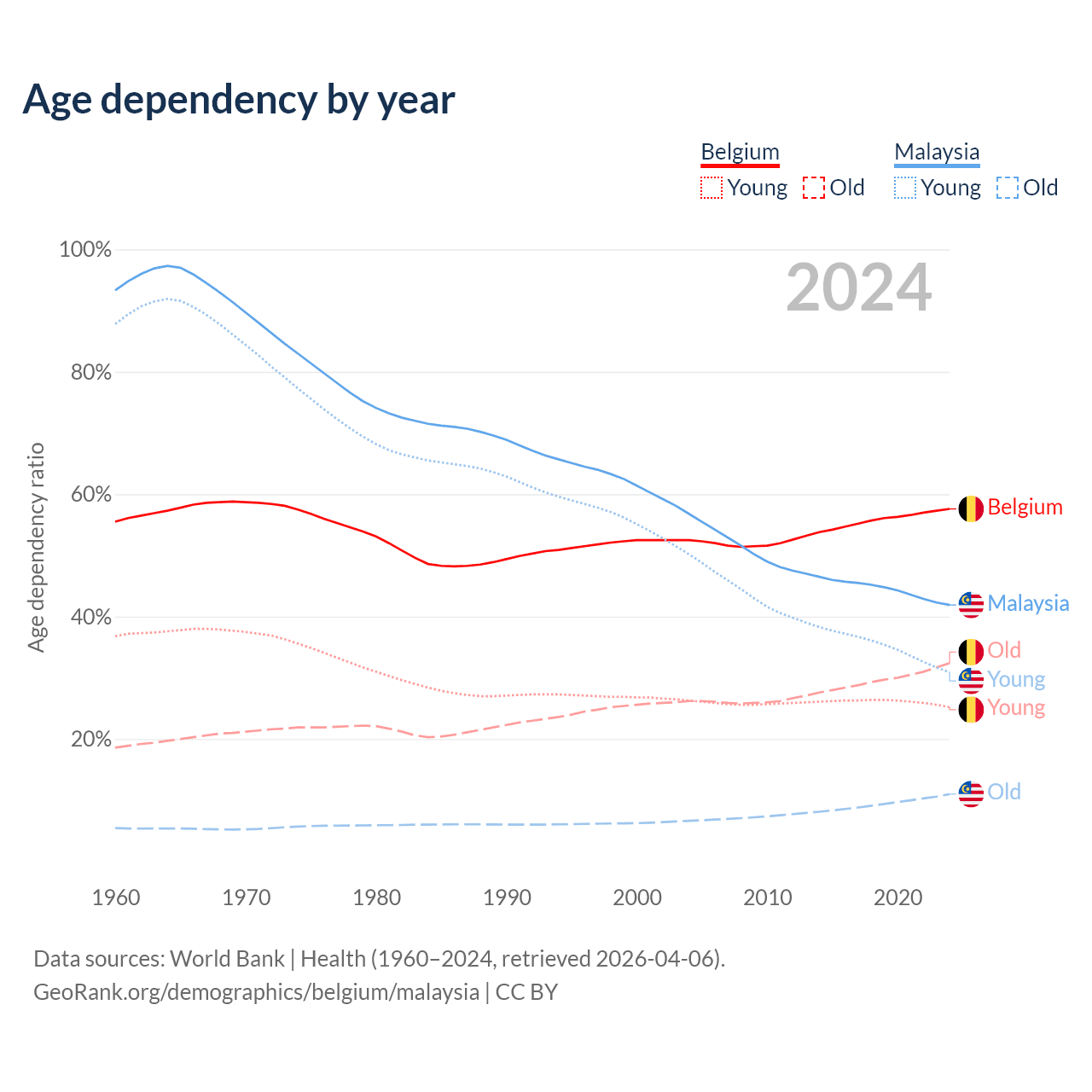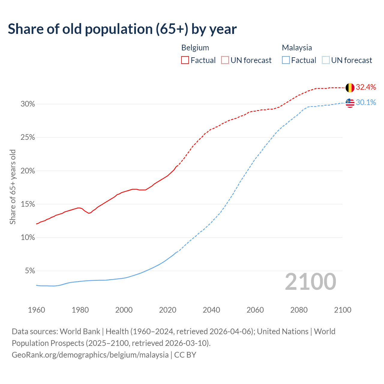 - The share of old-age demographic (65+) in Belgium is 20.6% vs 7.74% in Malaysia.