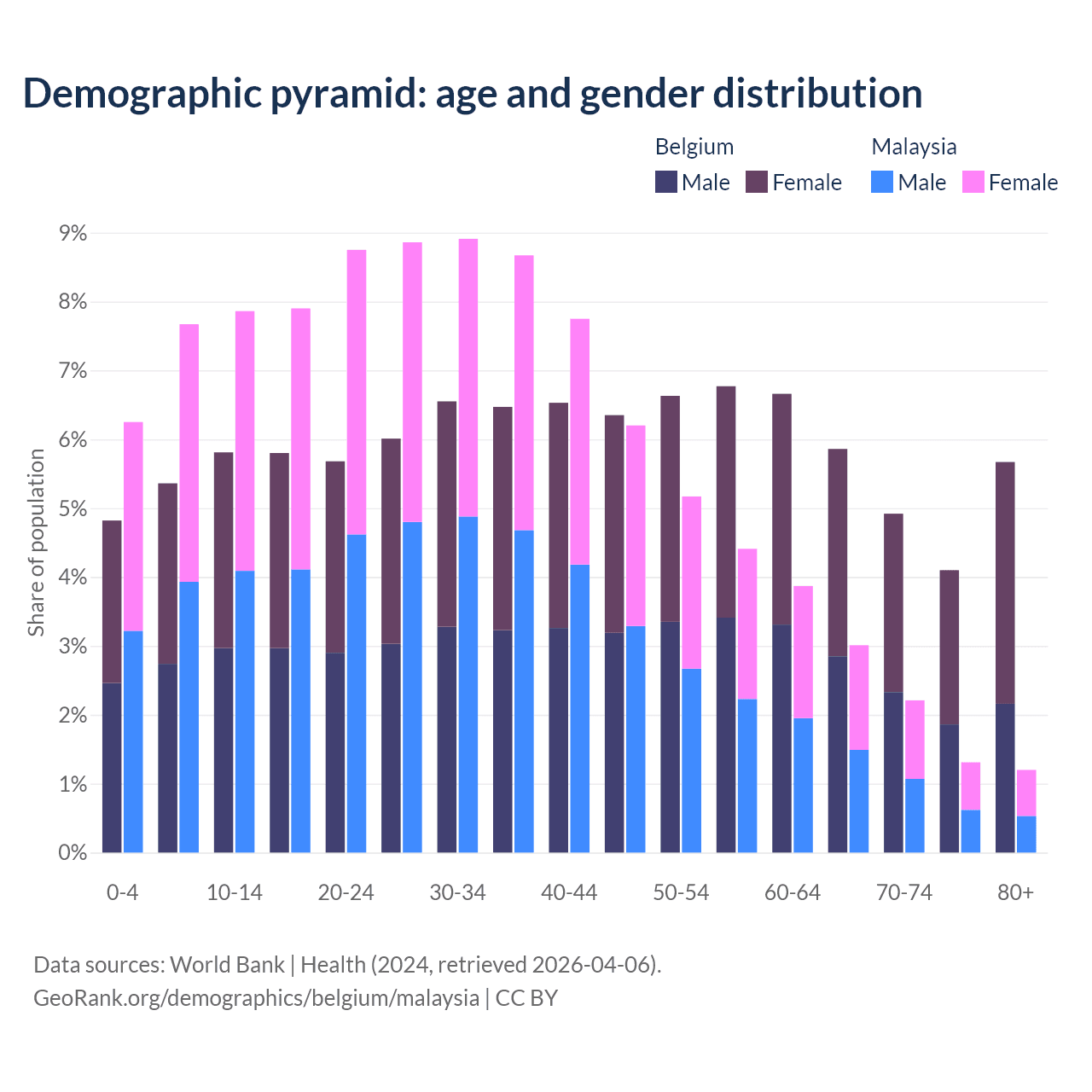 - Belgium is ranked 32/196 by median age (oldest to youngest) vs 92/196 for Malaysia.