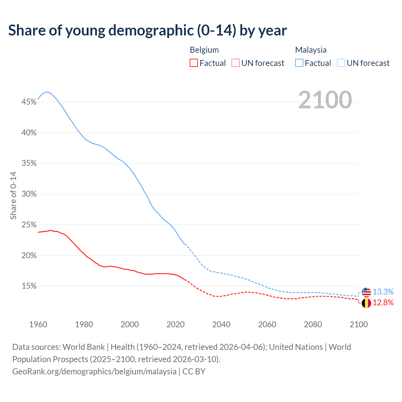- The share of young demographic (0-15 years old) in Belgium is 16% vs 21.8% in Malaysia.