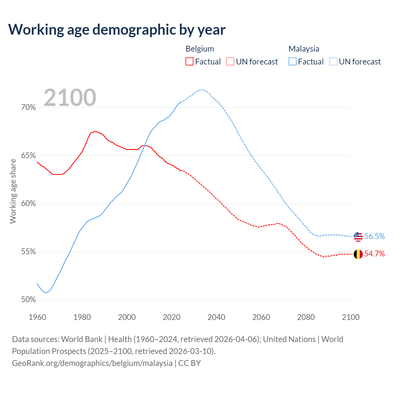 Median age Belgium vs Malaysia, 1960-2100