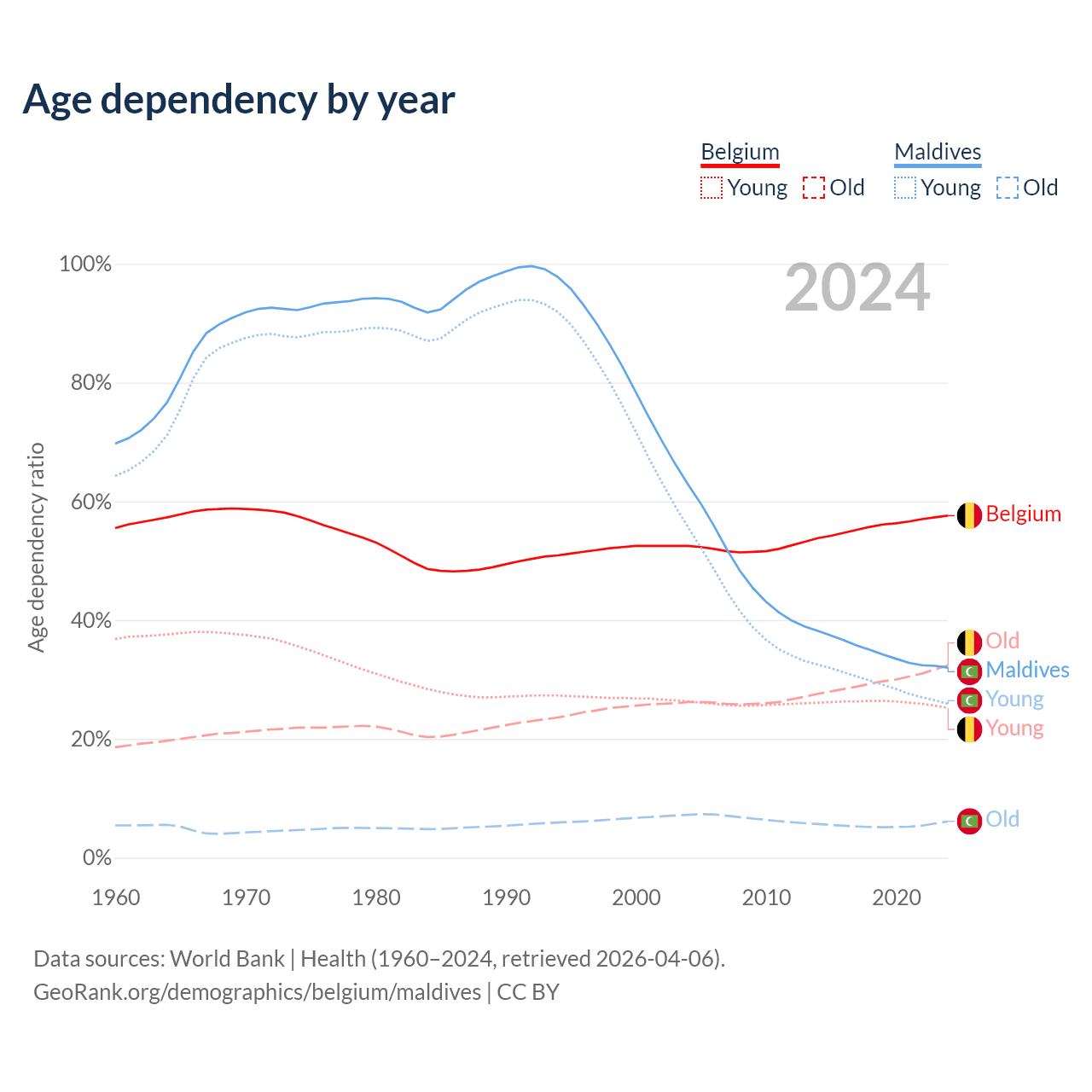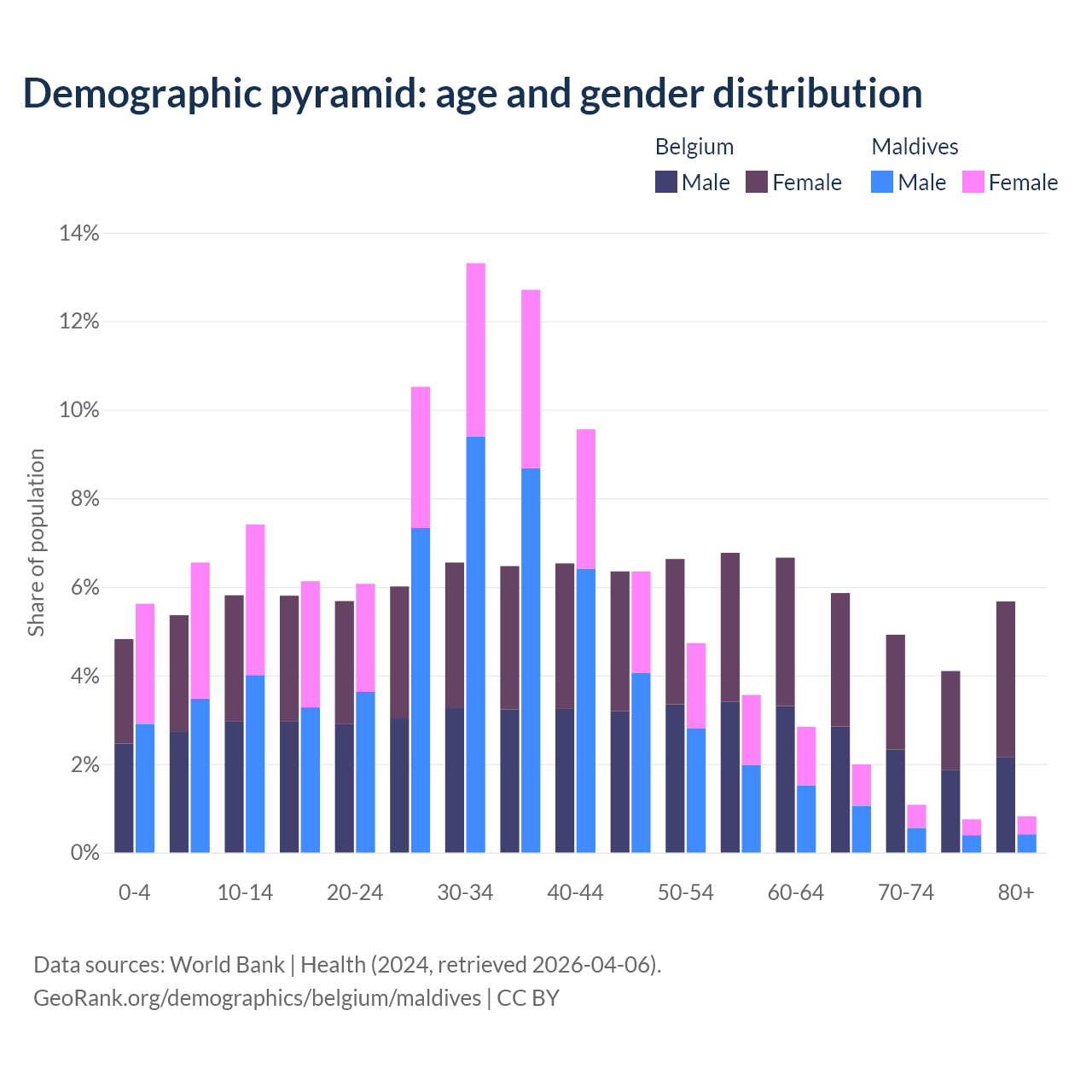 - Belgium is ranked 32/196 by median age (oldest to youngest) vs 90/196 for Maldives.