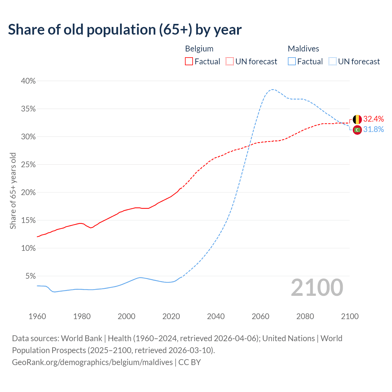 The share of older people aged 65 and over is 20.6% in Belgium and 4.64% in Maldives. Life expectancy in Belgium compared to Maldives .