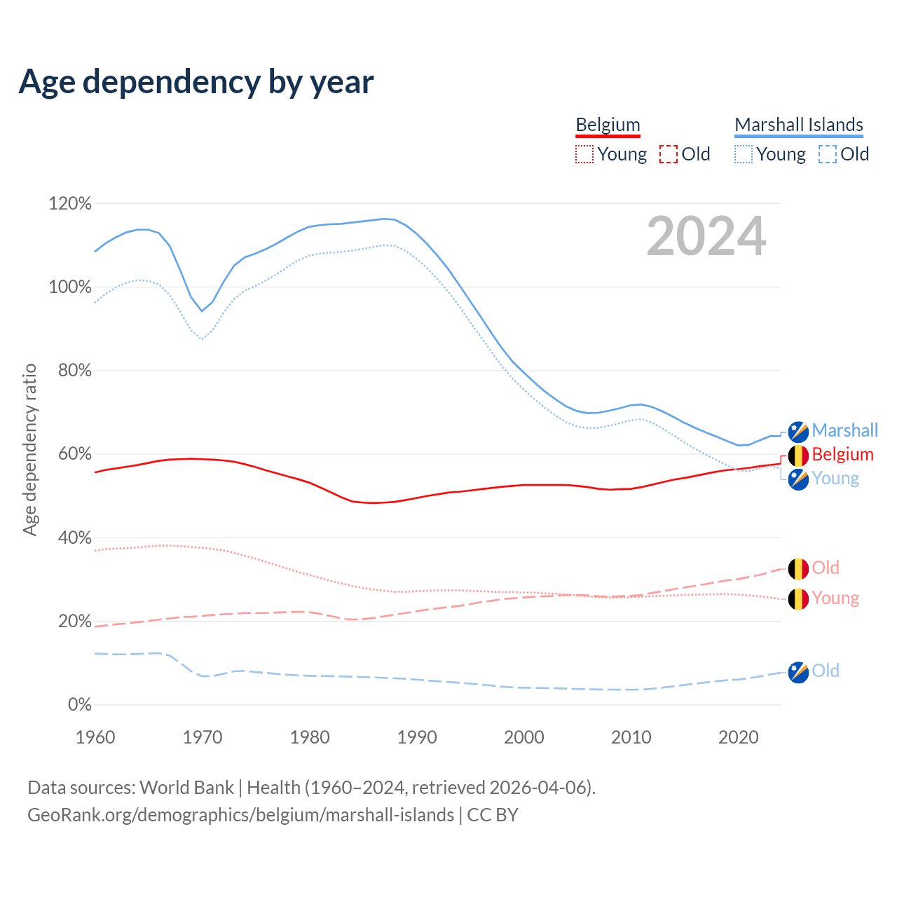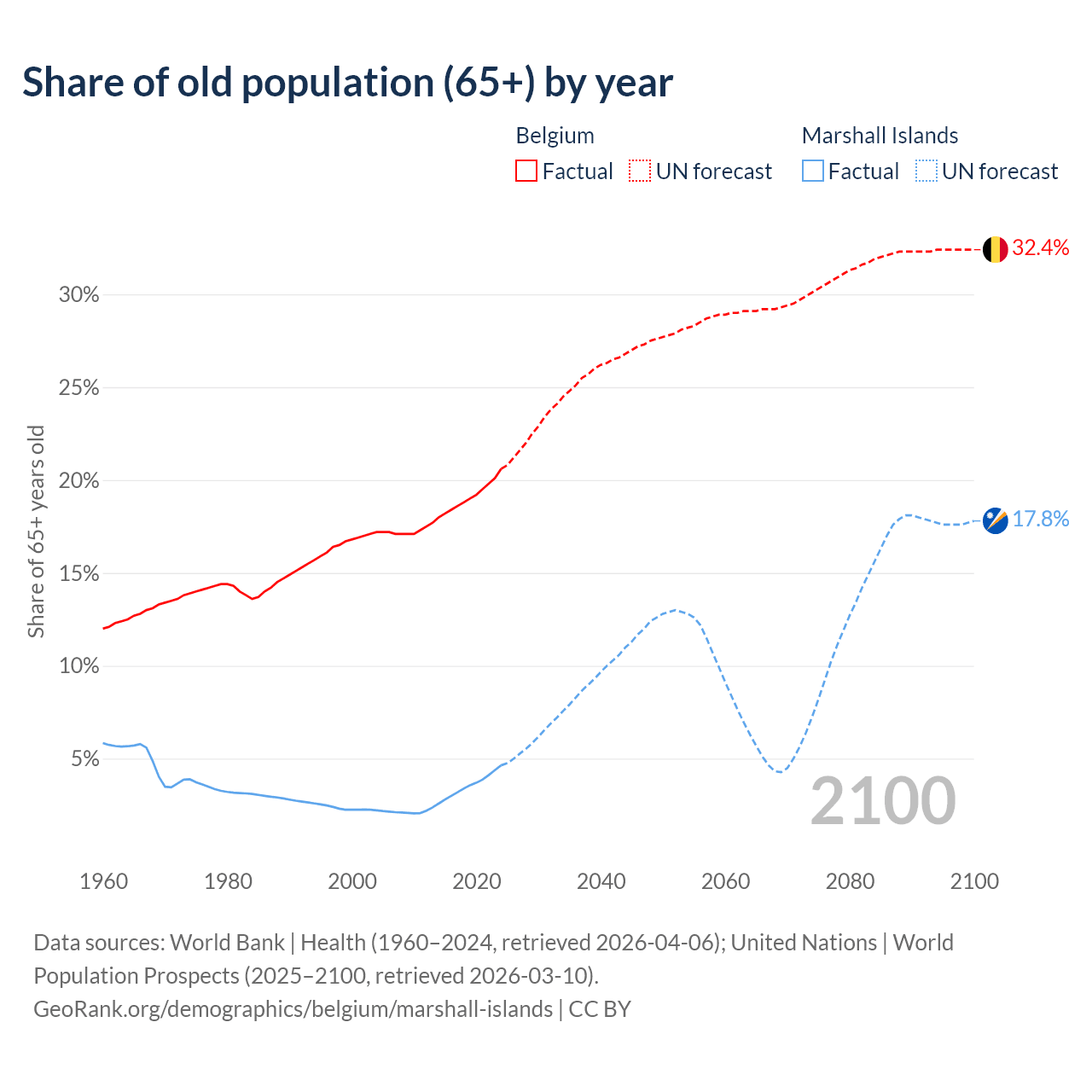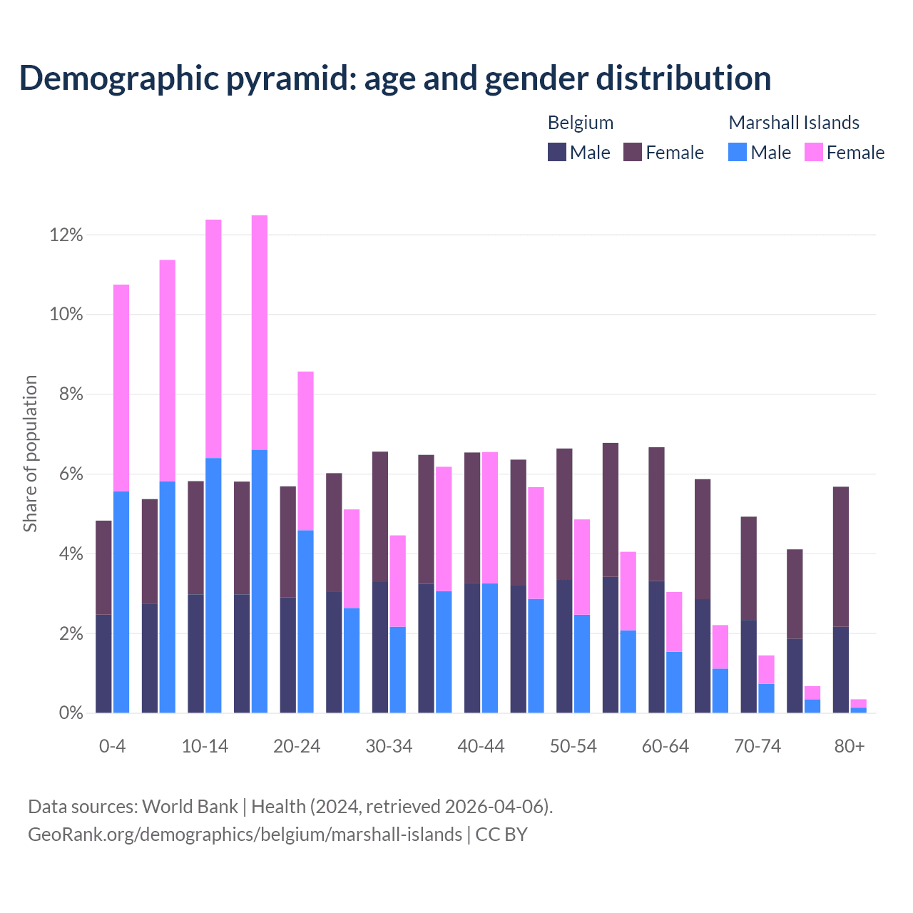 - The share of old-age demographic (65+) in Belgium is 20.6% vs 4.64% in the Marshall Islands.