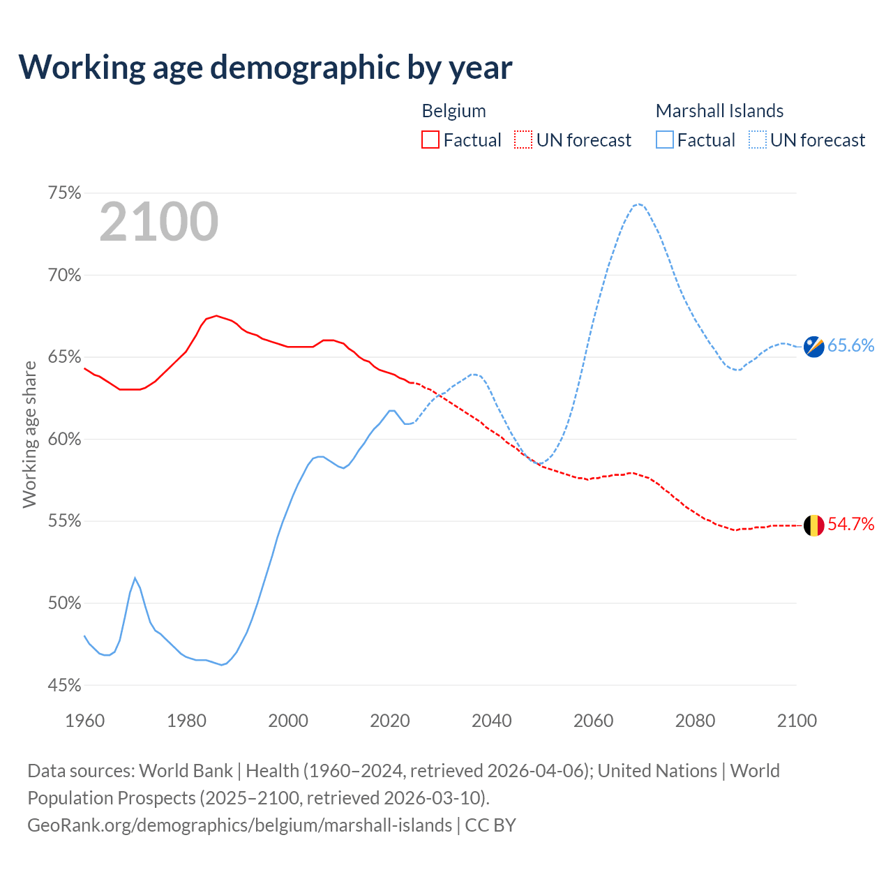 Median age Belgium vs Marshall Islands, 1960-2100