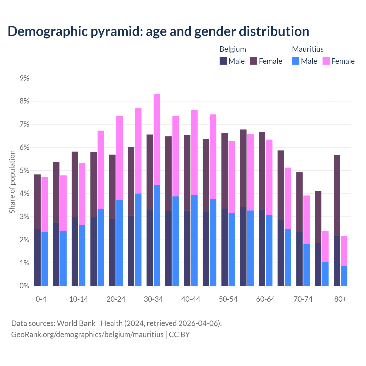 The share of older people aged 65 and over is 20.6% in Belgium and 13.5% in Mauritius. Life expectancy in Belgium compared to Mauritius .