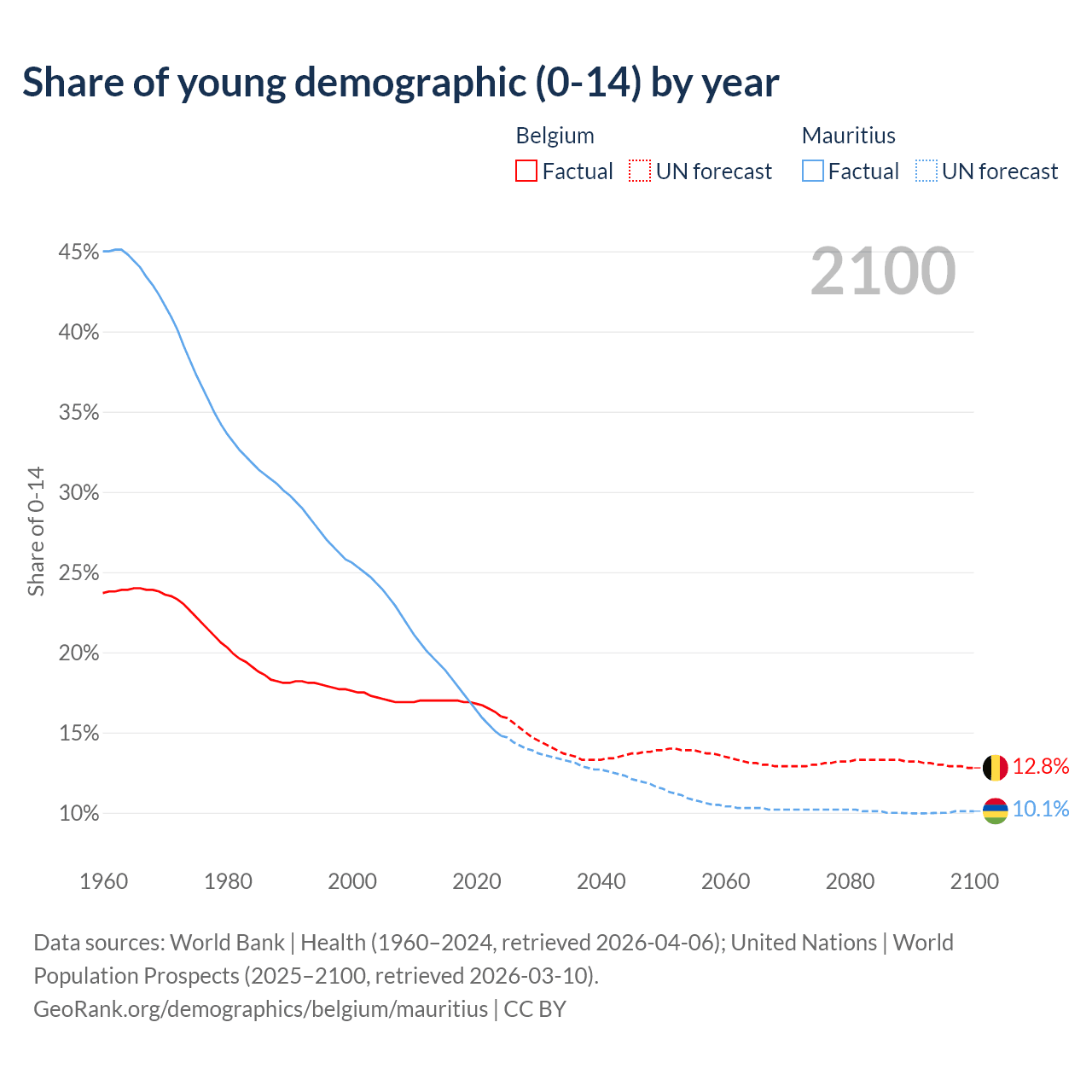 - The share of young demographic (0-15 years old) in Belgium is 16% vs 14.8% in Mauritius.
