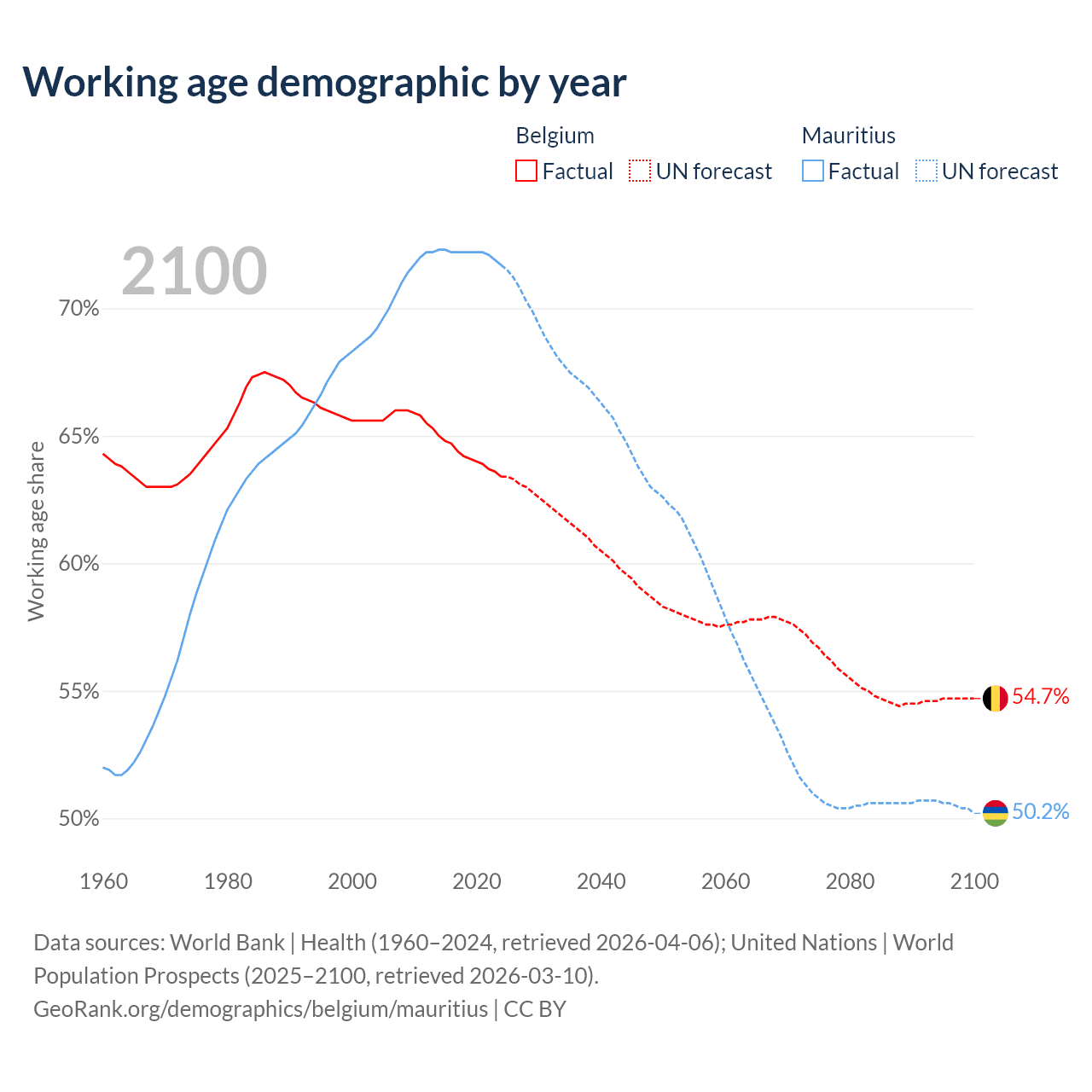 Median age Belgium vs Mauritius, 1960-2100
