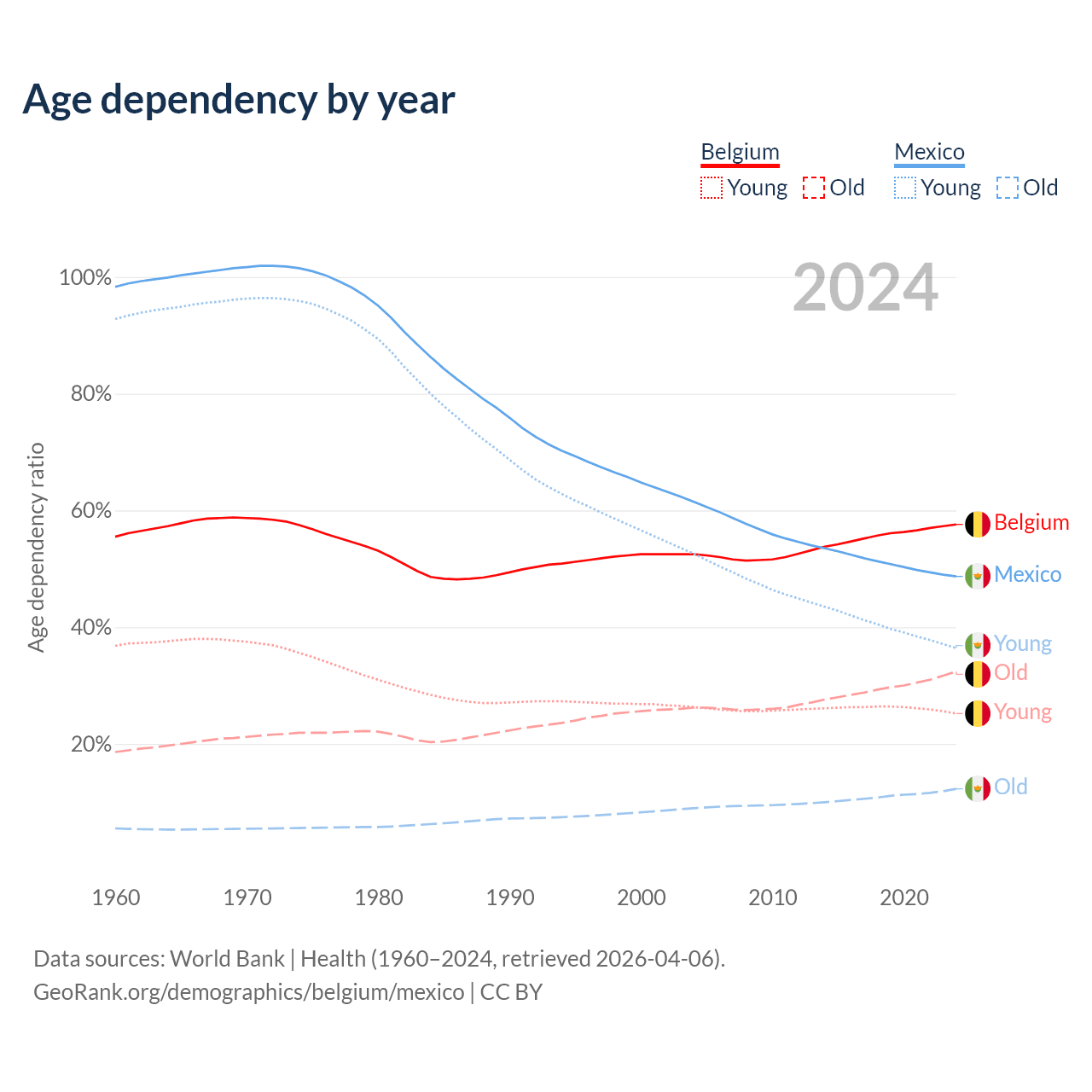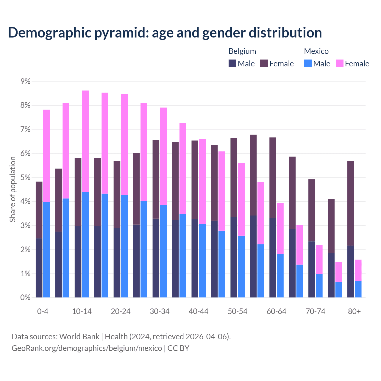 - Belgium is ranked 32/196 by median age (oldest to youngest) vs 102/196 for Mexico.